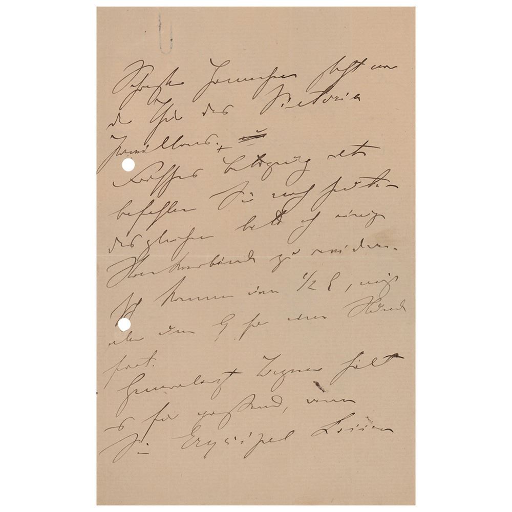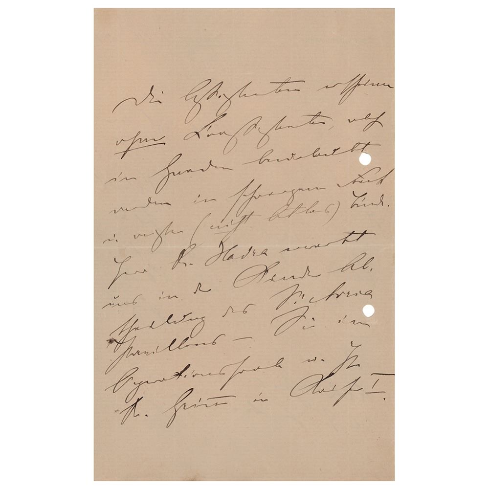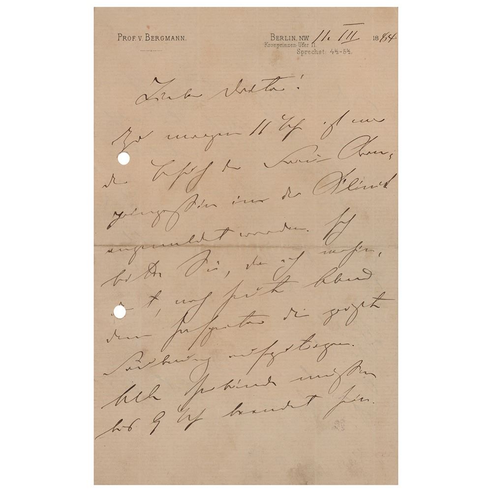 ALS in German, signed “E. Bergmann,†four pages on two adjoining sheets, 5.5 x 8.5, personal letterhead, March 11, 1884. Untranslated handwritten letter by the celebrated surgeon. In fine condition, with a rusty paperclip impression to the top and two filing holes to the edge.