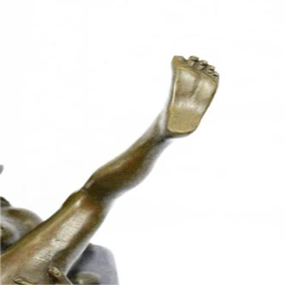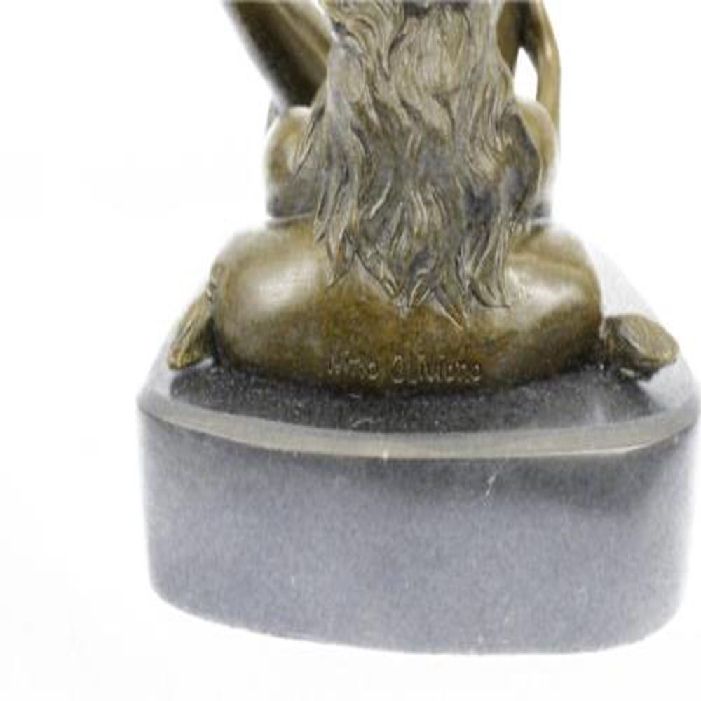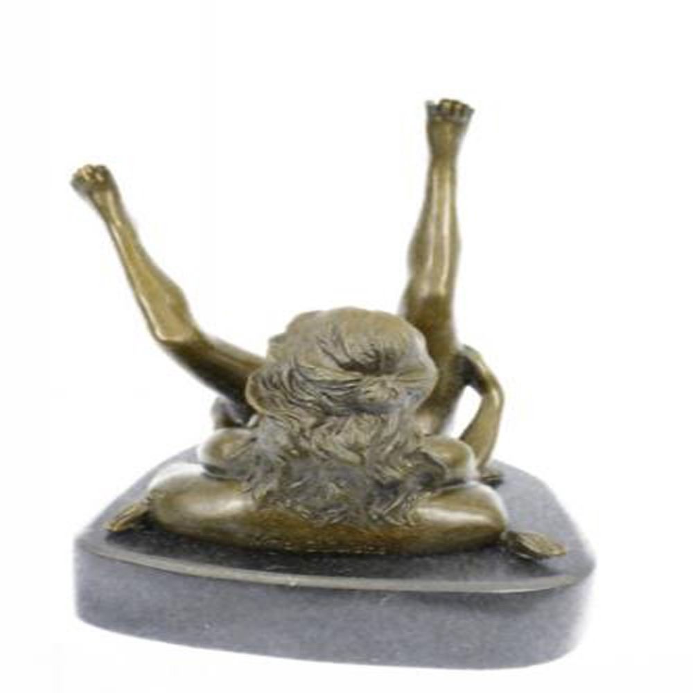 The nude Bronze seductress lies on her right side supported up by her right elbow. She looks out seductively as her hand invitingly beck one the beholder to come join in her gratification. Her left knee is bended upward as her left hand finds and shows the core of her desire. This bronze Sculpture was molded using lost wax casting followed by a coat of brown patina finish. She is mounted upon a marble base alluring the captivation of lovers of art and sexuality. Bronze Dimensions with Marble Base: Height 9 X Width 6 inches. Weight: 10 LBS.