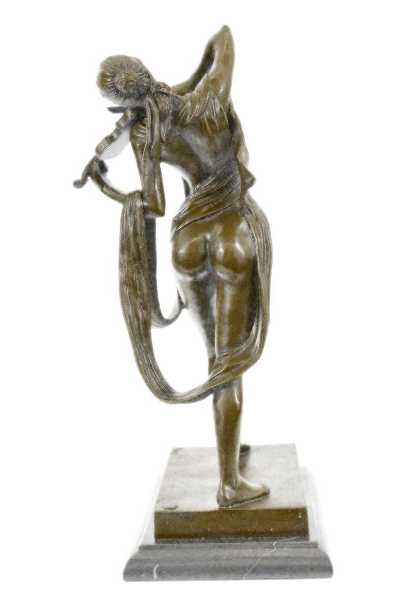 Peacefully entranced by her musical gift, this blind fold nude woman plays her violin. Her eyes are blind folded as she moves the bow back and forth creating beautiful delicate music. Her long hair lays down her back, on it is a studded headpiece that matches her dress. Her thin frame is draped in a wavy dress that sways from an unseen wind. This sculpture was crafted using the lost wax method. It rests on a black marble base. Bronze Dimensions with Marble Base: Height 17 X Width 9 inches. Weight: 20 LBS. Inventory: 49DS5567894