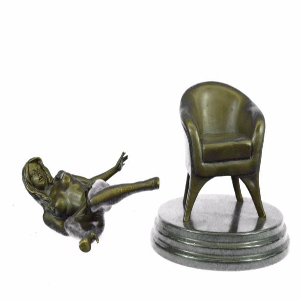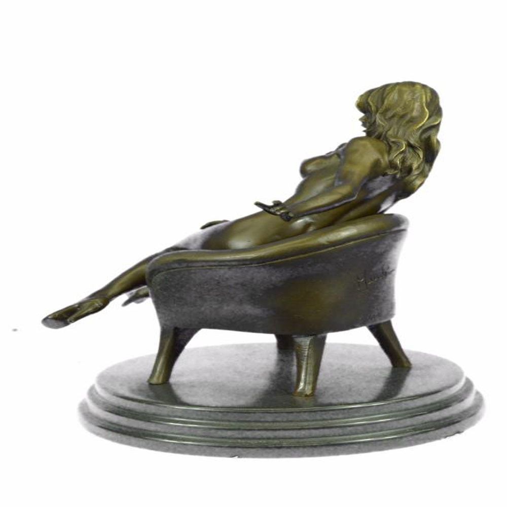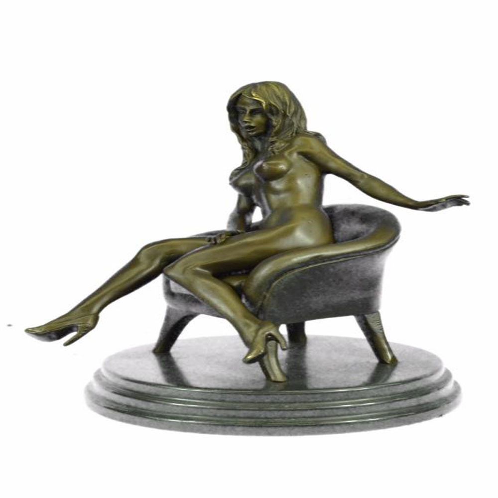 She sits side saddled on a sofa as the wind blows through her hair. She wears nothing and completely naked. Her breasts are exposed and her nipples are hard and pointy letting you know she is defiantly excited. This Sculpture was cast using the Lost Wax Method and has a two toned brown patina and is 100% Bronze. Bronze Dimensions with Marble Base: Height 10 X Width 9 inches. Weight: 10 LBS.