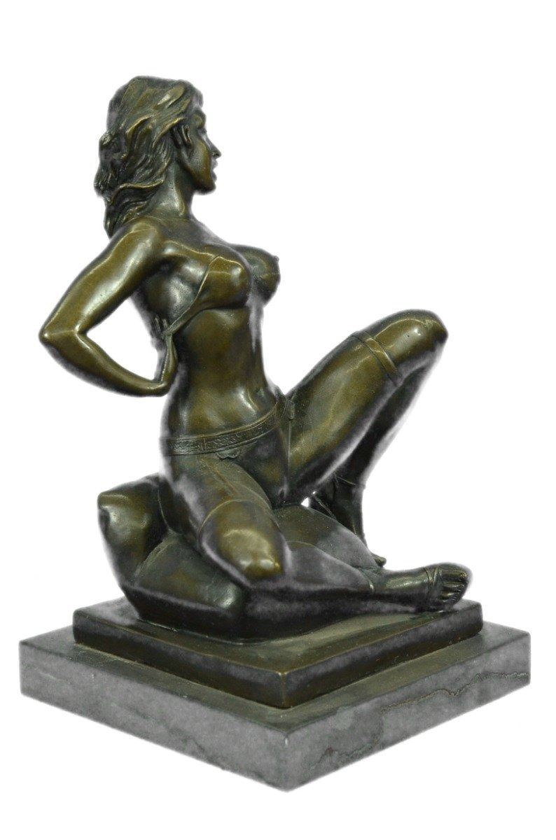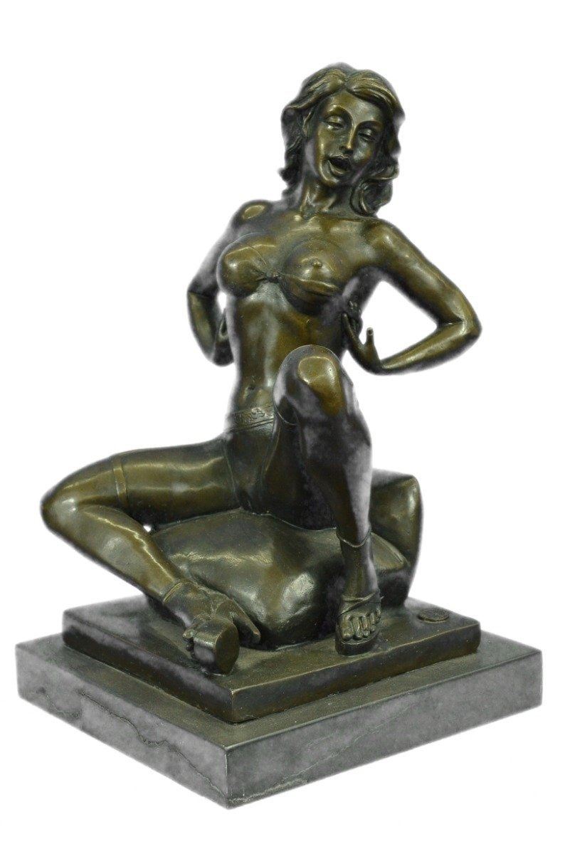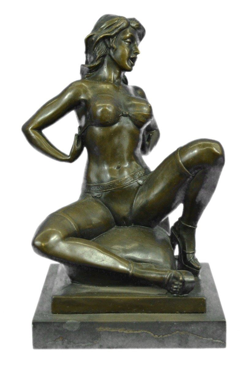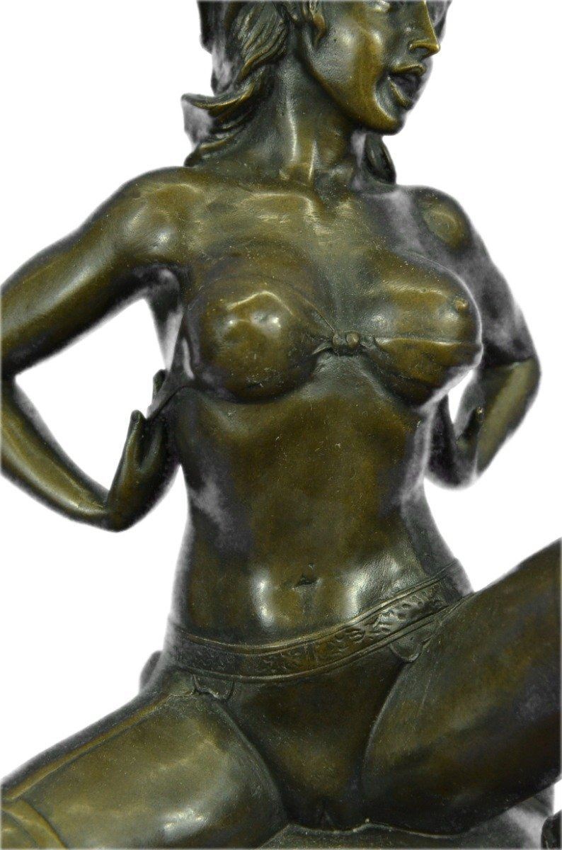 This highly erotic sculpture features a nude female in a very evocative pose exposing all of her body parts. She wears high heels while she is seated on a toilet in the midst of (I leave it to your imagination). Wavy tendrils of hair frame her slender face and by her facial expression, one can readily see that she is enjoying her activity. This piece is definitely a great conversation starter and would make a great gift for yourself or for someone who likes to be amused. Despite its subject matter,this bronze sculpture is still a masterful and fine detailed execution, cast using the lost wax method and is signed Preiss, ensuring a highly detailed work of art that will be a treasure for years to come. Bronze Dimensions with Marble Base: Height 13 X Width 7 inches. Weight: 15 LBS. Inventory: 31Y6155613