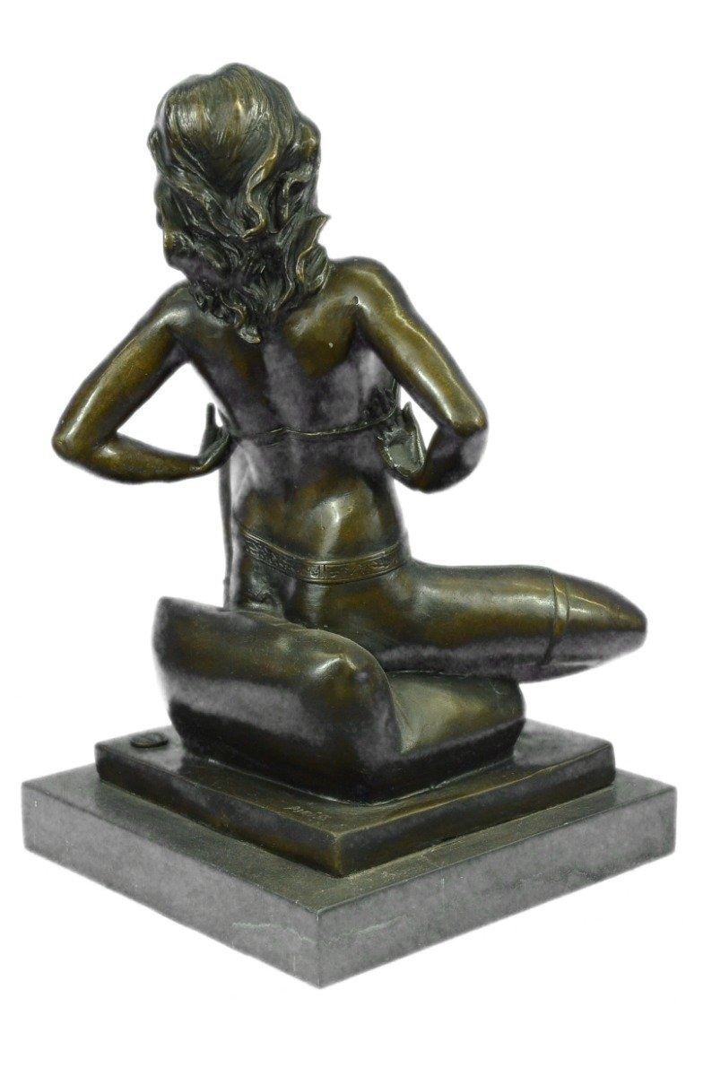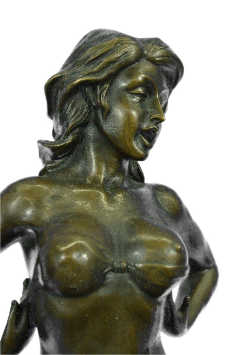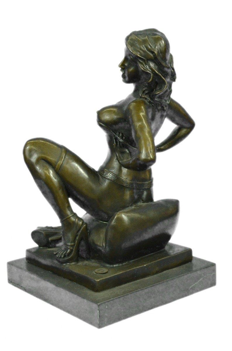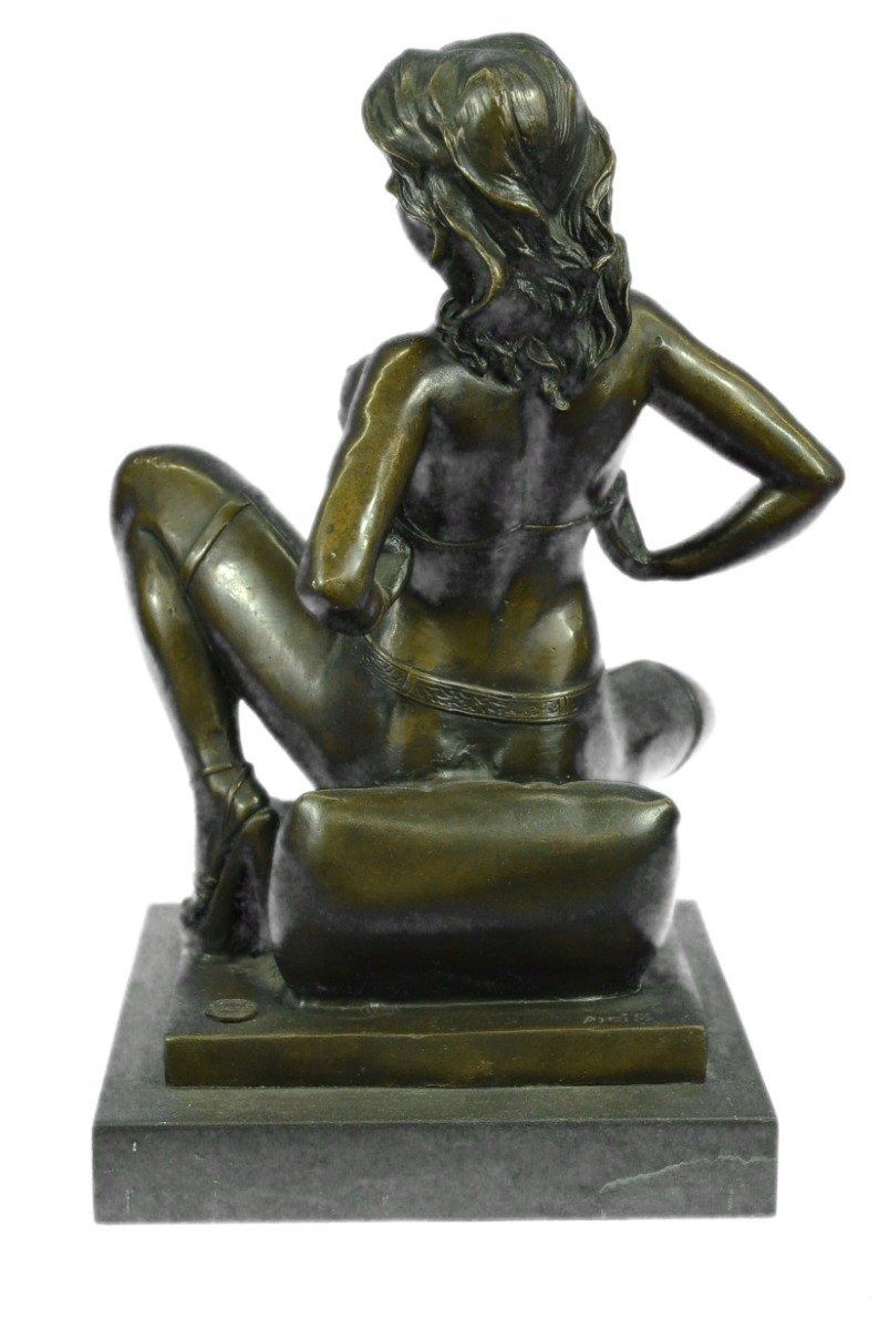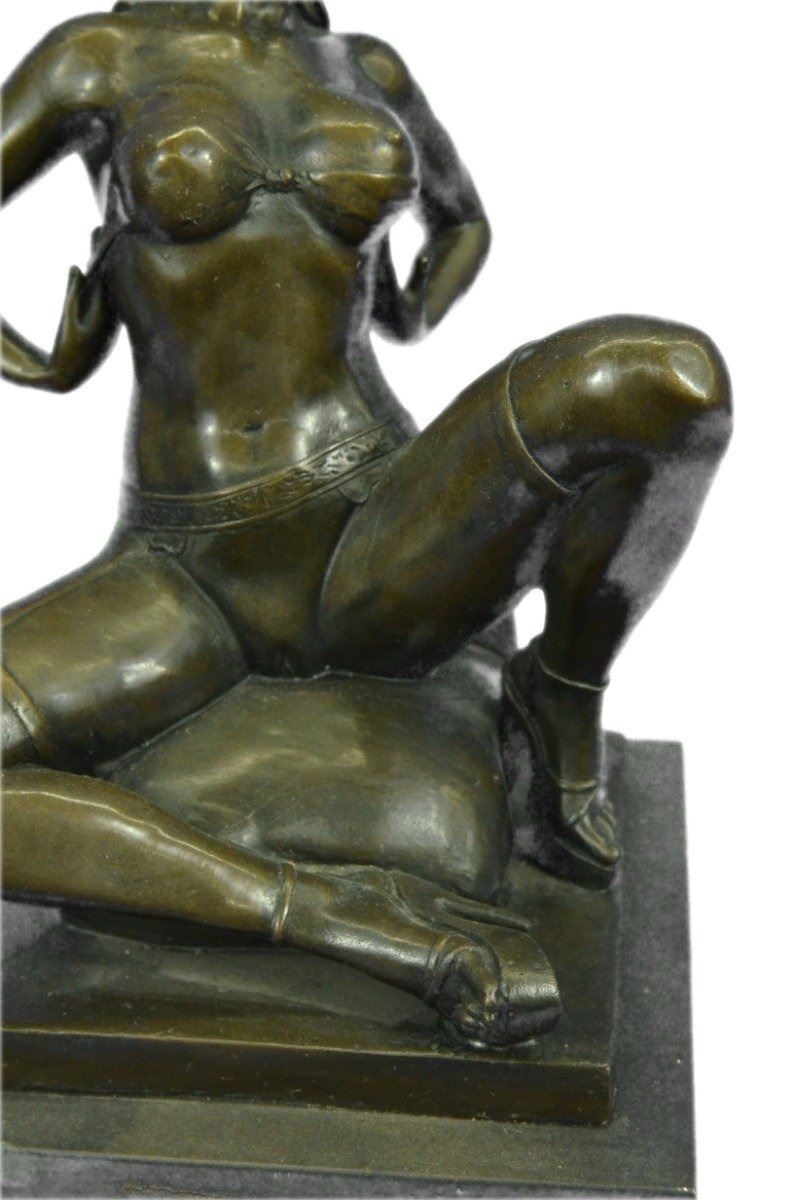 This highly erotic sculpture features a nude female in a very evocative pose exposing all of her body parts. She wears high heels while she is seated on a toilet in the midst of (I leave it to your imagination). Wavy tendrils of hair frame her slender face and by her facial expression, one can readily see that she is enjoying her activity. This piece is definitely a great conversation starter and would make a great gift for yourself or for someone who likes to be amused. Despite its subject matter,this bronze sculpture is still a masterful and fine detailed execution, cast using the lost wax method and is signed Preiss, ensuring a highly detailed work of art that will be a treasure for years to come. Bronze Dimensions with Marble Base: Height 13 X Width 7 inches. Weight: 15 LBS. Inventory: 31Y6155613