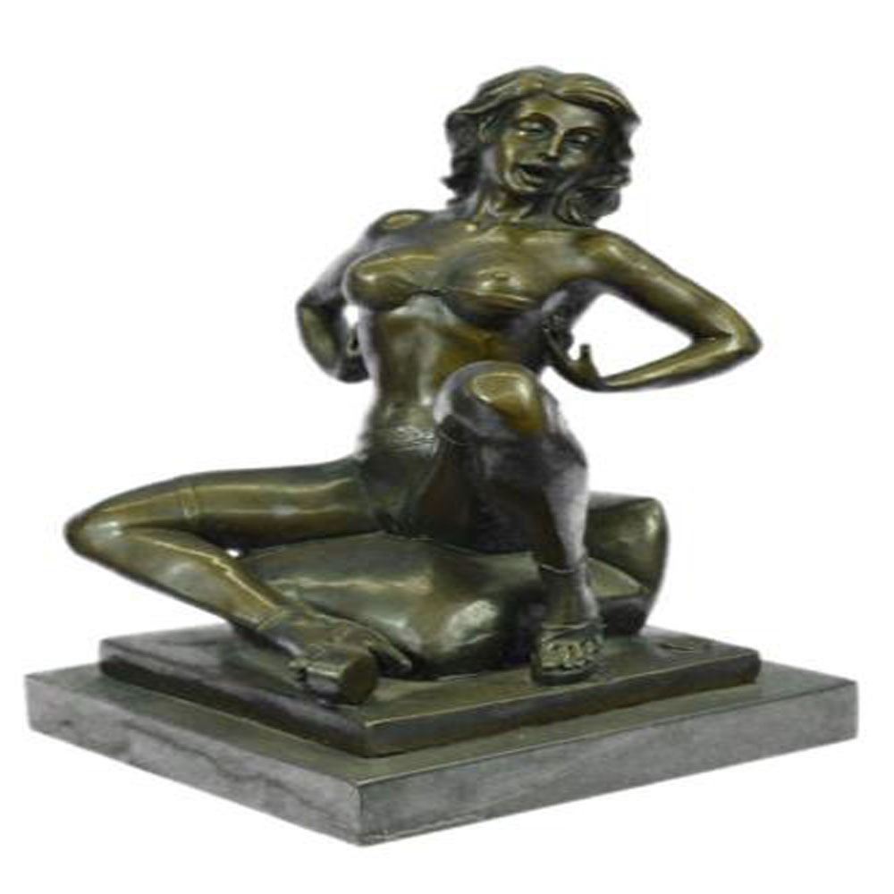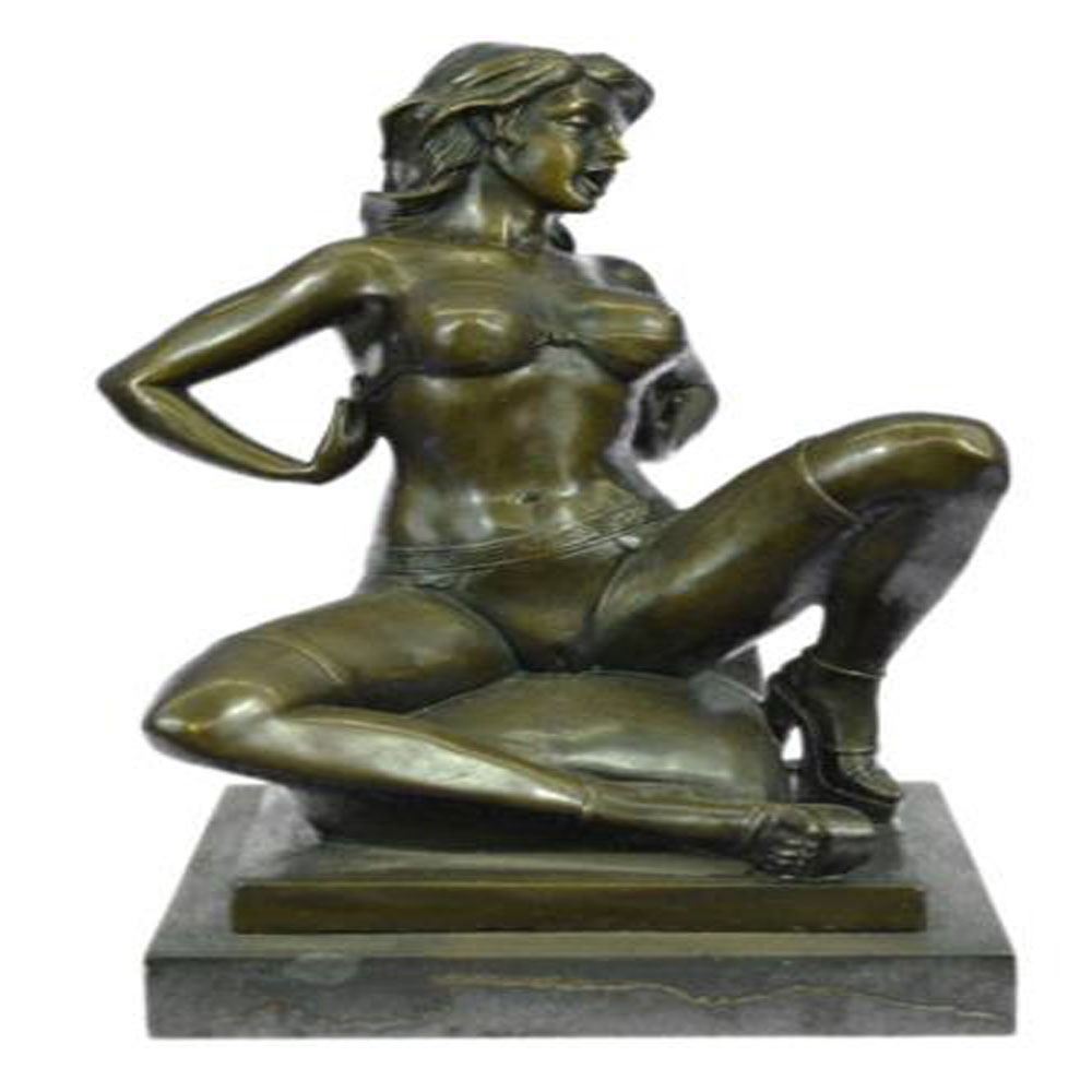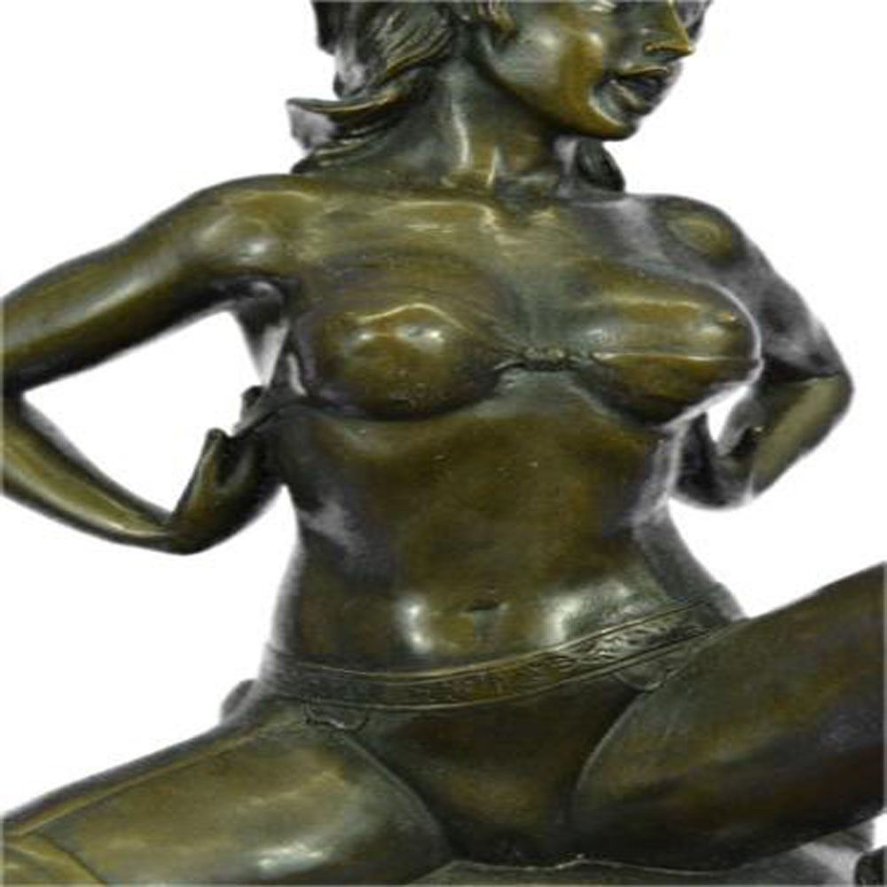 This highly erotic Sculpture features a nude female in a very evocative pose exposing all of her body parts. She wears high heels while she is seated on a toilet in the midst of (I leave it to your imagination). Wavy tendrils of hair frame her slender face and by her facial expression, one can readily see that she is enjoying her activity. This piece is definitely a great conversation starter and would make a great gift for yourself or for someone who likes to be amused. Despite its subject matter,this Bronze Sculpture is still a masterful and fine detailed execution, cast using the lost wax method and is signed Preiss, ensuring a highly detailed work of art that will be a treasure for years to come. Bronze Dimensions with Marble Base: Height 13 X Width 7 inches. Weight: 15 LBS.