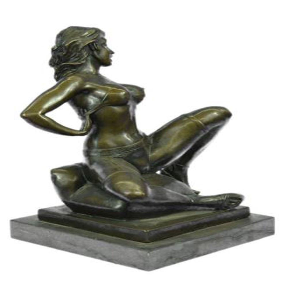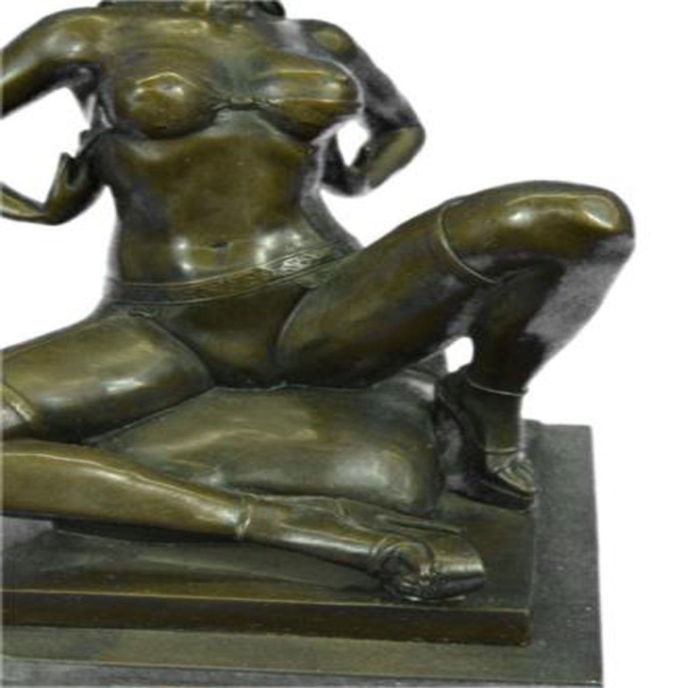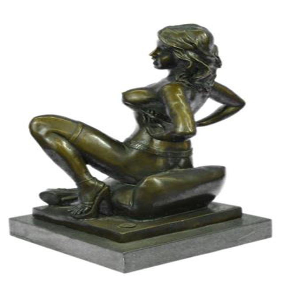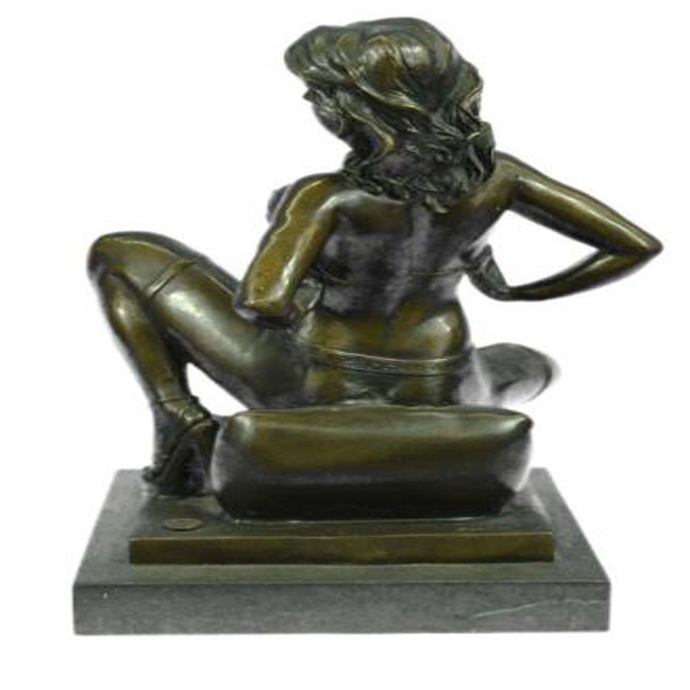 This highly erotic Sculpture features a nude female in a very evocative pose exposing all of her body parts. She wears high heels while she is seated on a toilet in the midst of (I leave it to your imagination). Wavy tendrils of hair frame her slender face and by her facial expression, one can readily see that she is enjoying her activity. This piece is definitely a great conversation starter and would make a great gift for yourself or for someone who likes to be amused. Despite its subject matter,this Bronze Sculpture is still a masterful and fine detailed execution, cast using the lost wax method and is signed Preiss, ensuring a highly detailed work of art that will be a treasure for years to come. Bronze Dimensions with Marble Base: Height 13 X Width 7 inches. Weight: 15 LBS.