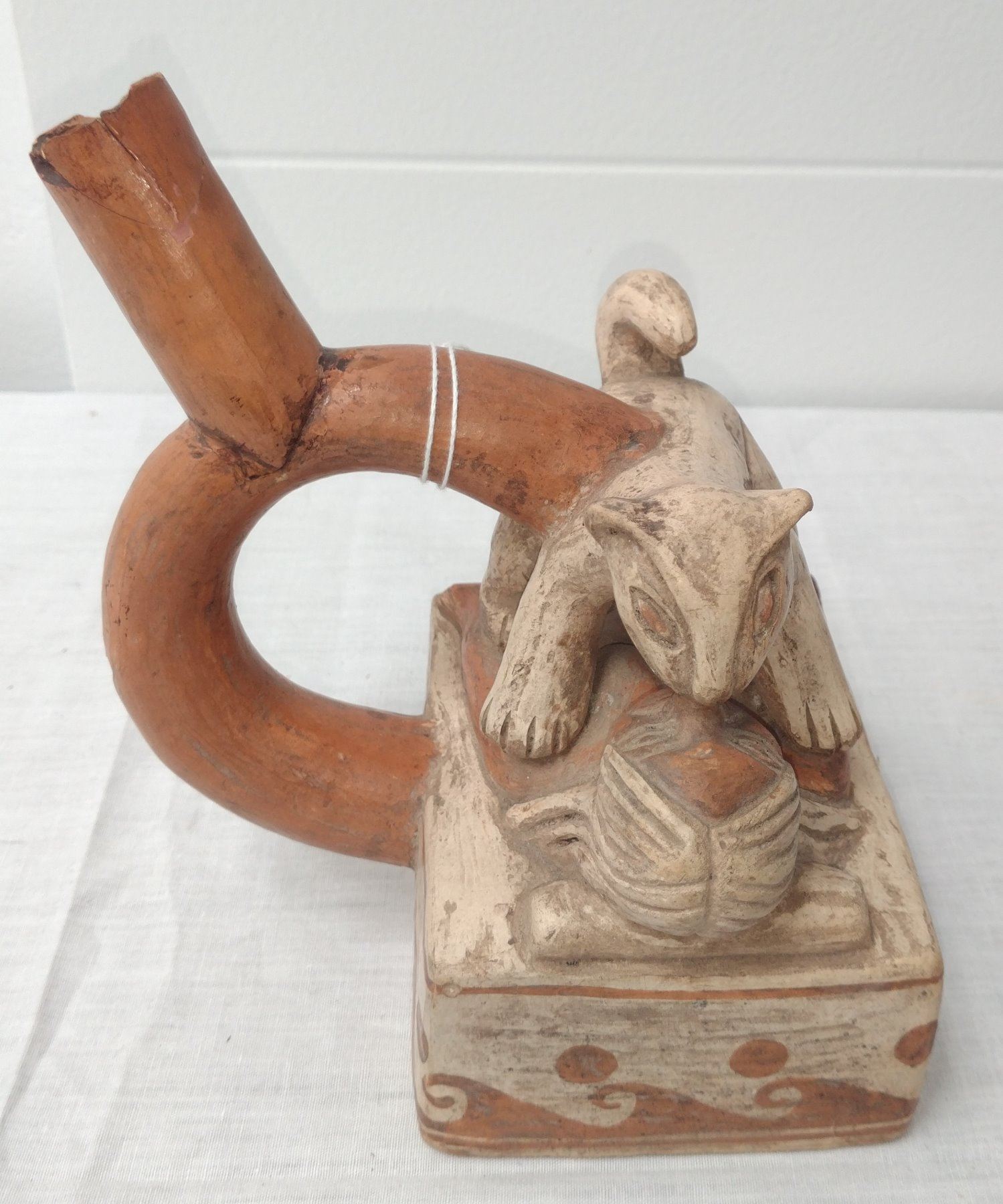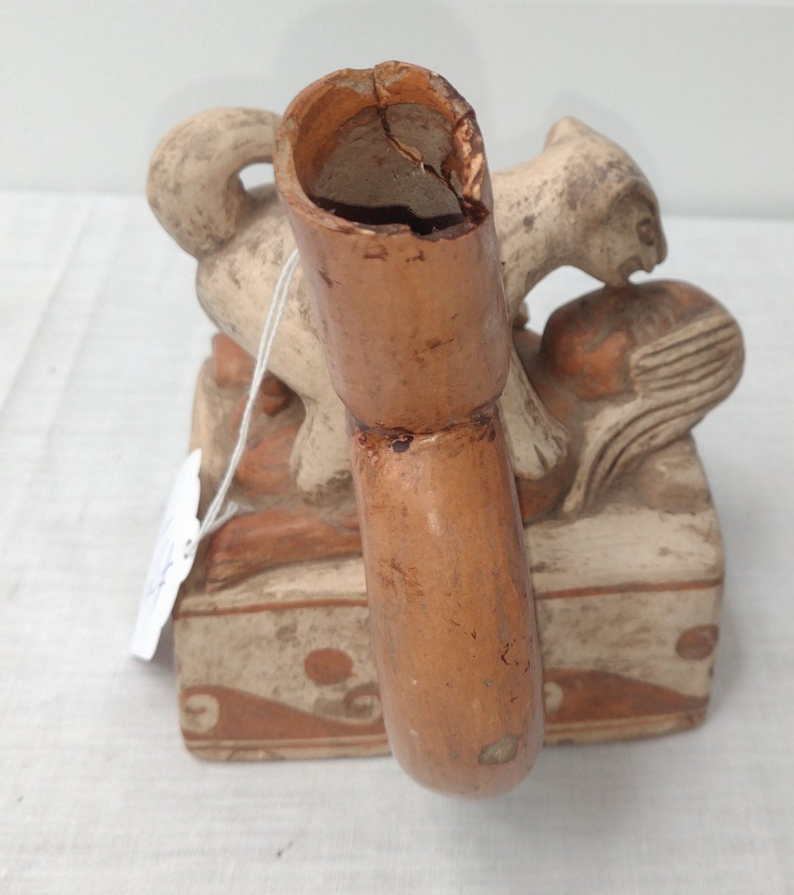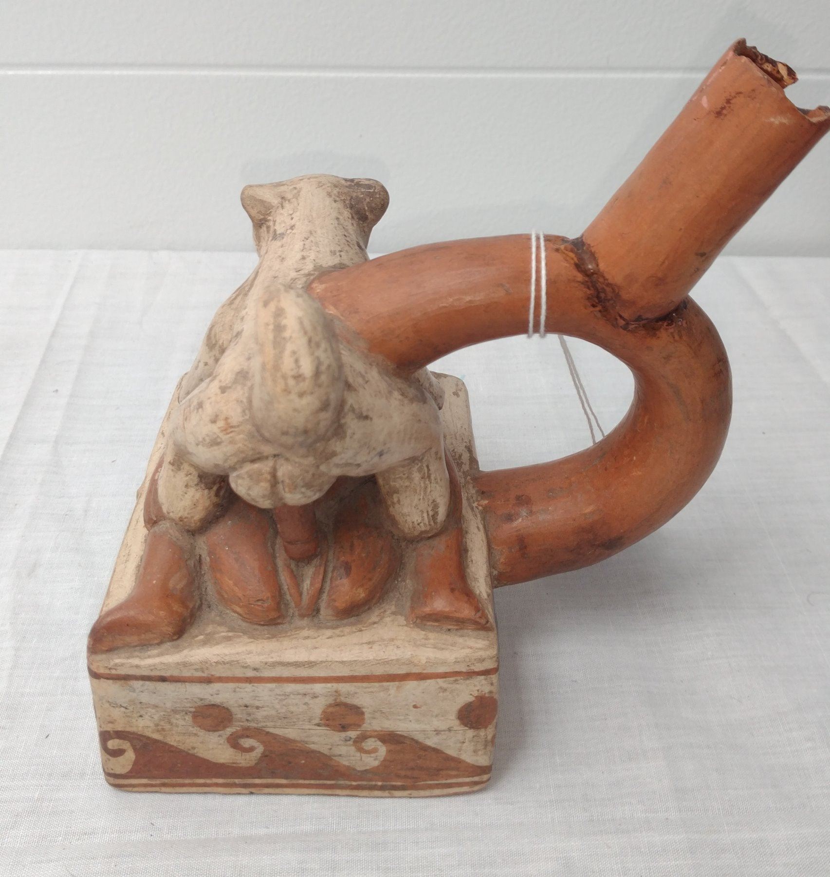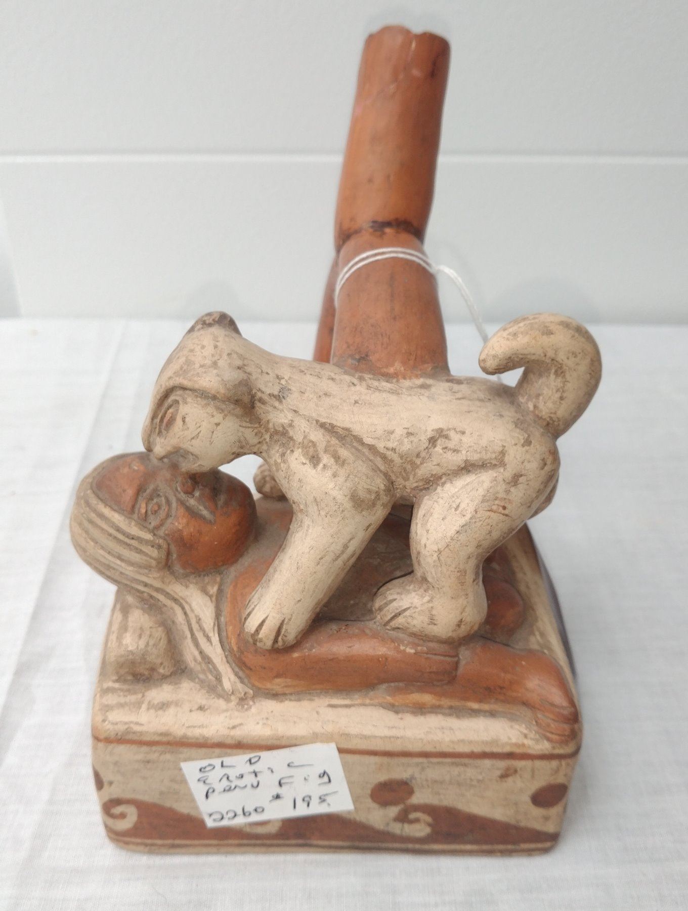 Erotic Stirrup Pot, pre-Columbian item. Made of clay and paint, the item measures 7" x 6" x 5". Bolivia. Condition: Damage to spout, see images. Shipping: $30.00 w/insurance and signature, double-boxed.