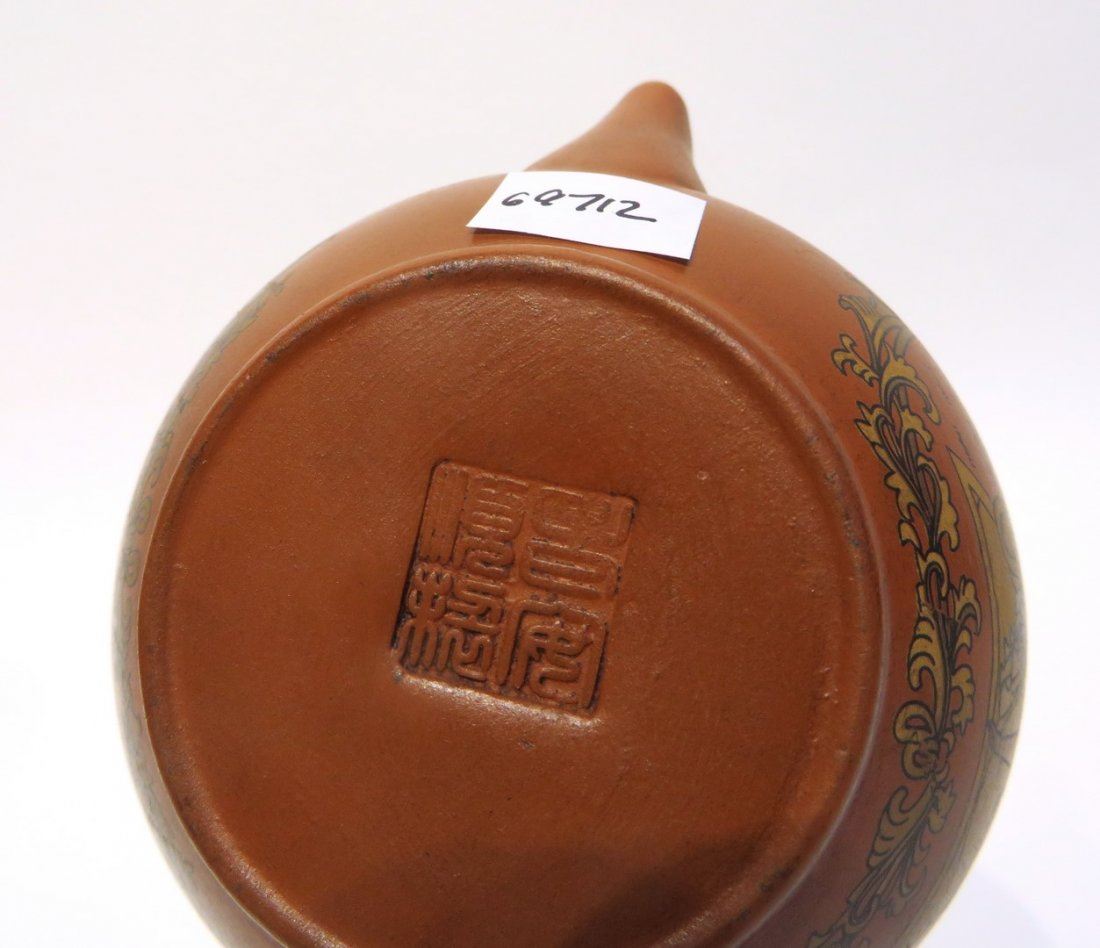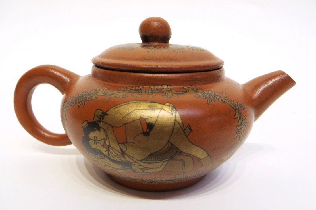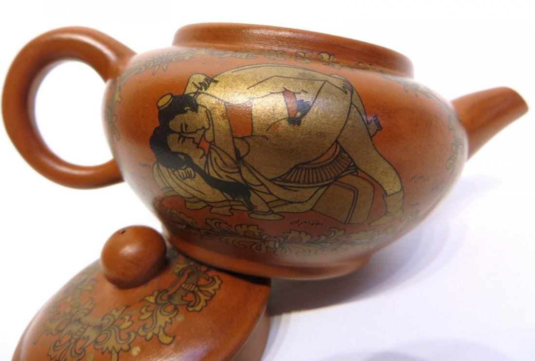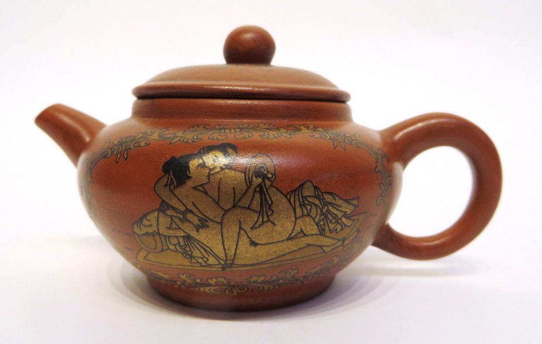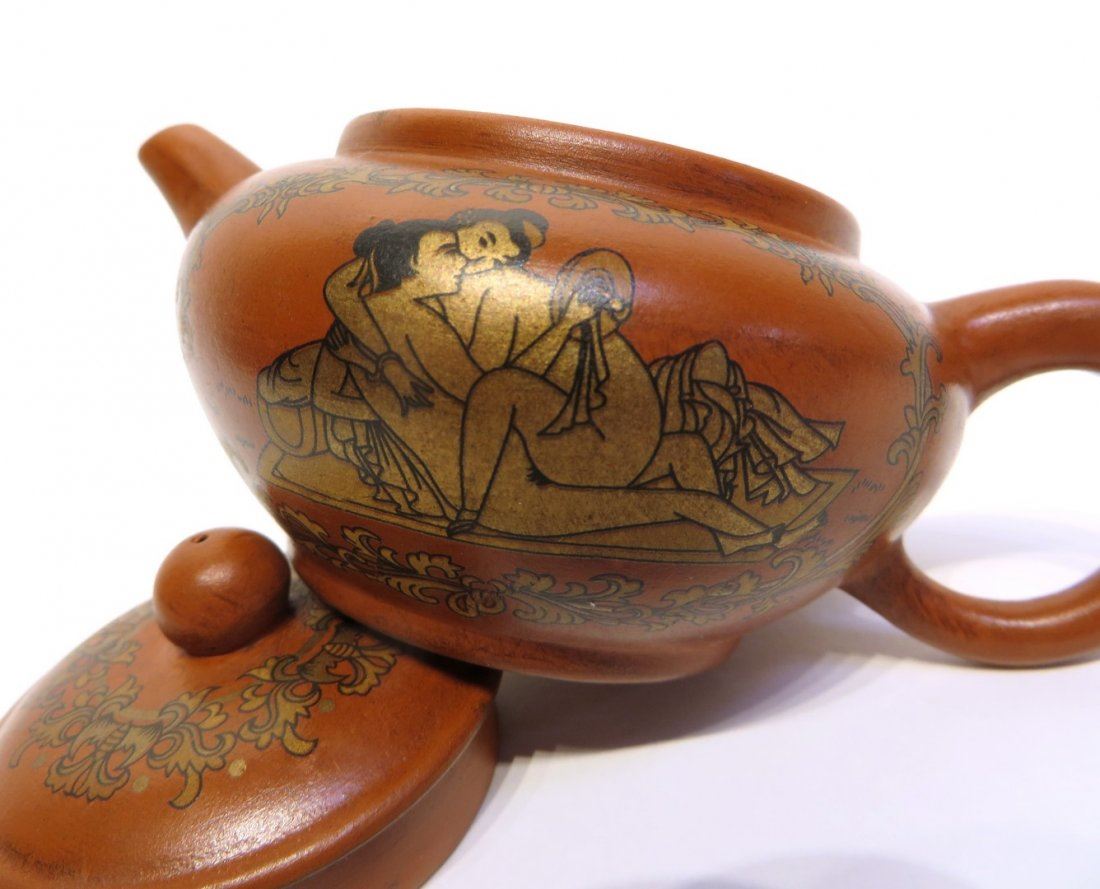 A terra cotta tea pot with an erotic scene in gold with pen and ink. Marked on the bottom. Only 20 lots in this sale have reserves, marked with "R" at end of description.