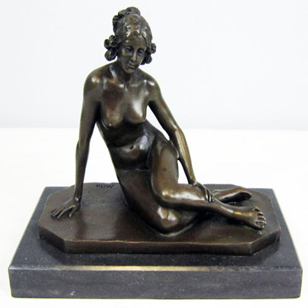 A confident young woman reveals her long curvy legs and fully nude to stir envy amongst other women and to provoke lust amongst men whom indulge her beauty. A figure of feminism, the woman holds tremendous power to draw men to her toes by nothing more than a glimpse of her golden skin, The handmade Bronze Sculpture was cast using the archaic method of lost wax casting and stained with a brown patina finish for perpetuation and is mounted upon a marble base. Bronze Dimensions with Marble Base: Height 9 X Width 11 inches. Weight: 12 LBS.