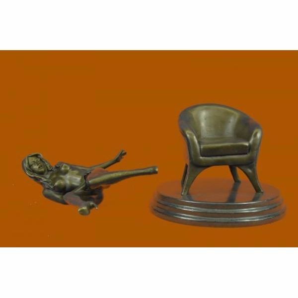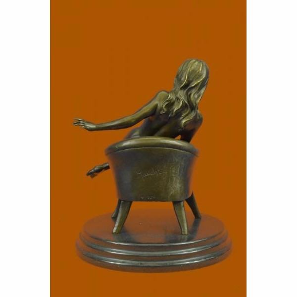 She sits side saddled on a sofa as the wind blows through her hair. She wears nothing and completely naked. Her breasts are exposed and her nipples are hard and pointy letting you know she is defiantly excited. This sculpture was cast using the Lost Wax Method and has a two toned brown patina. Bronze Dimensions with Marble Base: Height 10 X Width 9 inches. Weight: 10 LBS.