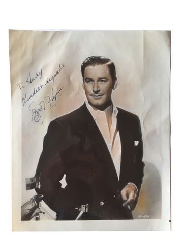 Errol Flynn personally signed autograph: "To Henry, Kindest regards". Numbered EF-484. (8"x10"). In 1933, Flynn was discovered by Warner Bros. while he was performing in a play in London. He was brought to Hollywood and signed to a contract. Flynn's first film was Captain Blood (1935), which was a huge success. He quickly became one of the most popular actors in Hollywood, and he starred in a string of successful swashbuckler films, including The Adventures of Robin Hood (1938), The Sea Hawk (1940), and The Adventures of Don Juan (1948). The photo is creased througout but still makes for a great piece of rare Hollywood memorabilia.