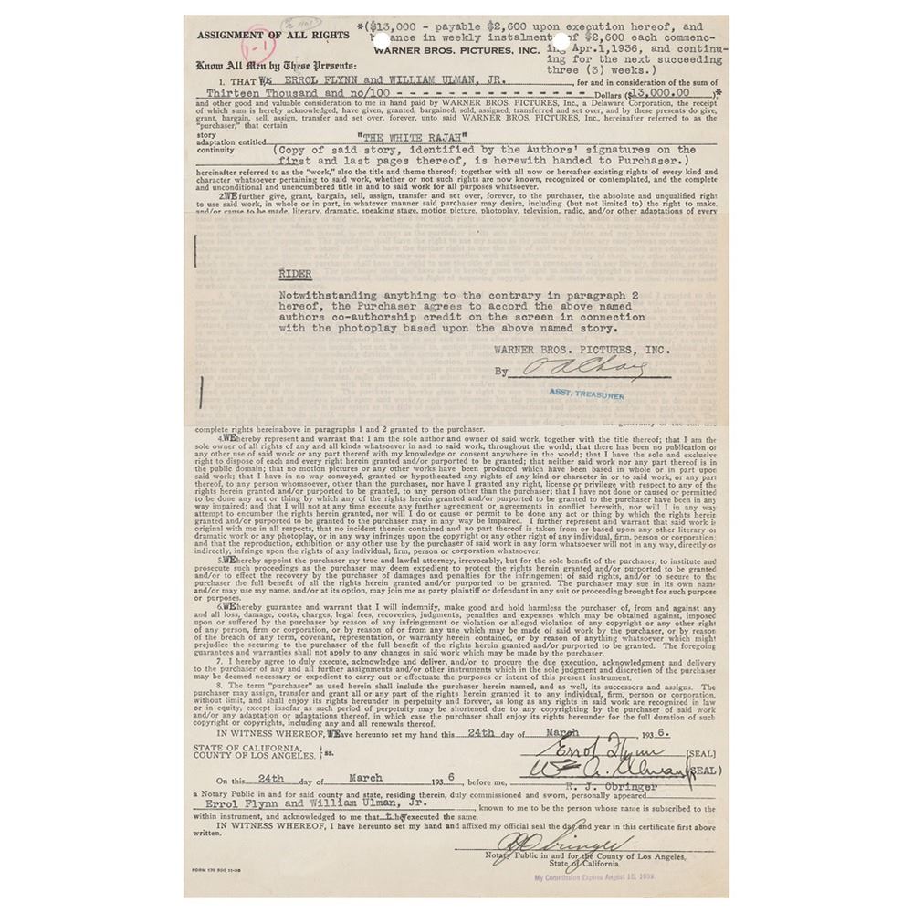 DS, one page, 8.25 x 13.5, March 24, 1936. A contract between Warner Bros. Pictures and Errol Flynn and William Ulman, Jr., in which the pair agree to deliver "the story adaptation entitled 'THE WHITE RAJAH'" for the sum of $13,000. Signed at the conclusion in fountain pen by both Flynn and Ulman. A Warner Bros. rider is attached to the front of the document. In fine condition, with binder and filing holes to upper portion.