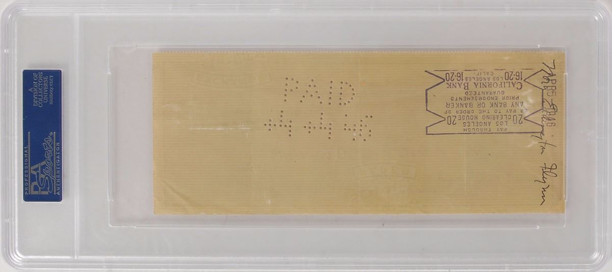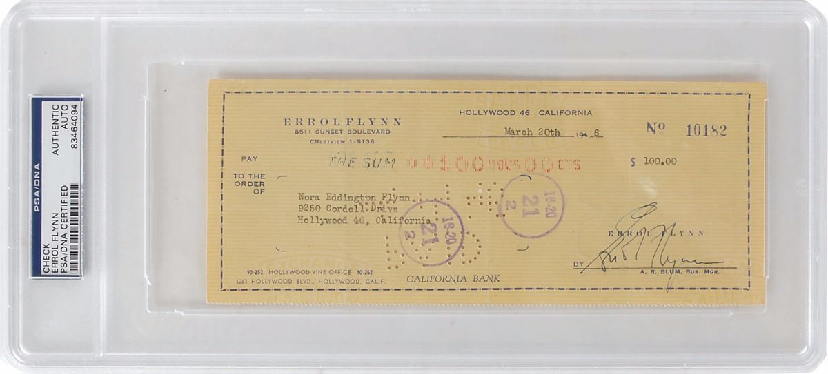 Personal check, 8.25 x 3.25, filled out in type and signed by Flynn, payable to Nora Eddington Flynn for $100, March 20, 1946. Encapsulated in a plastic PSA/DNA authentication holder. In fine condition.