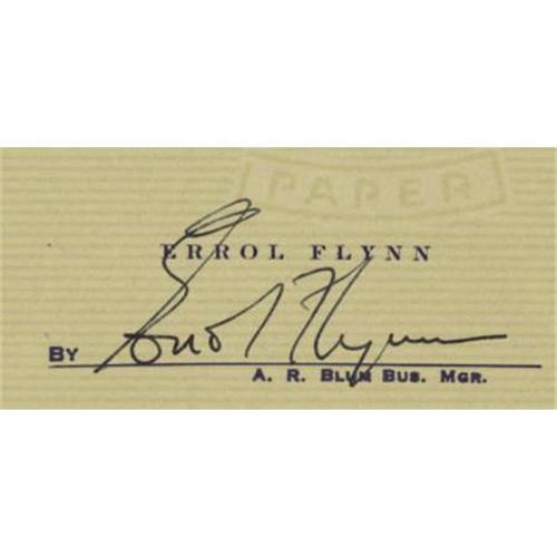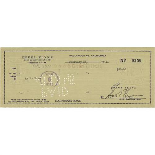 <B>Errol Flynn Signed Check.</B></I> A personal check for $60, dated February 28, 1945, with a large, bold signature by Flynn in black ink. In Very Fine to Excellent condition with the usual bank cancellation marks. <I>Accompanied by a COA from PSA/DNA.</B></I><BR><BR><b>Shipping:</b> Flat Material, Small (<a target="_blank" href="http://www.heritageauctions.com/common/shipping.php">view shipping information</a>)