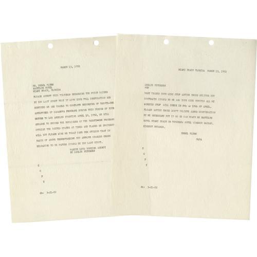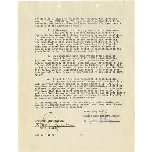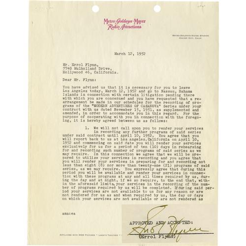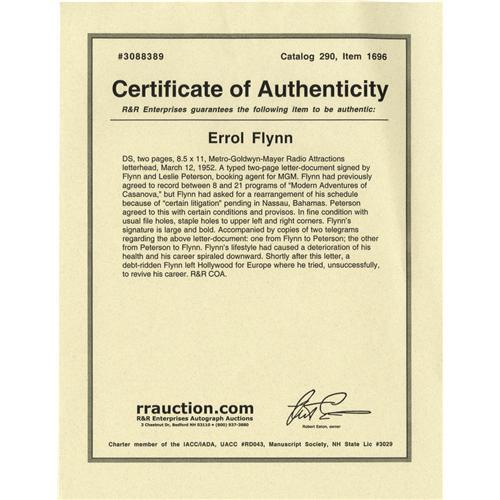 <B>Errol Flynn Signed Contract and Telegrams.</B></I> A two-page letter-document on MGM Radio Attractions letterhead dated March 12, 1952, signed by Flynn and MGM booking agent Leslie Peterson on the last page in black and blue ink, respectively. The agreement is in regards to Flynn's appearing in episodes of <I>Modern Adventures of Casanova.</B></I> Also included are two telegrams between Flynn and peterson relating to the document. Flynn's lifestyle had caused both his health and his career to deteriorate; shortly after this letter, a debt-ridden Flynn moved from Hollywood to Europe in a failed bid to revive his career. The documents are in Very Fine condition with the usual file and staple holes. <I>Accompanied by a certificate of authenticity.</B></I><I>Accompanied by LOA from PSA/DNA.</B></I><BR><BR><b>Shipping:</b> Flat Material, Small (<a target="_blank" href="http://www.heritageauctions.com/common/shipping.php">view shipping information</a>)