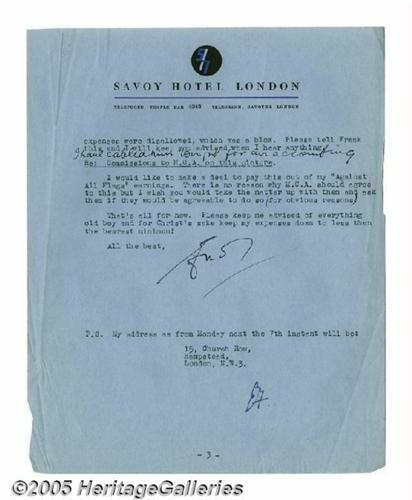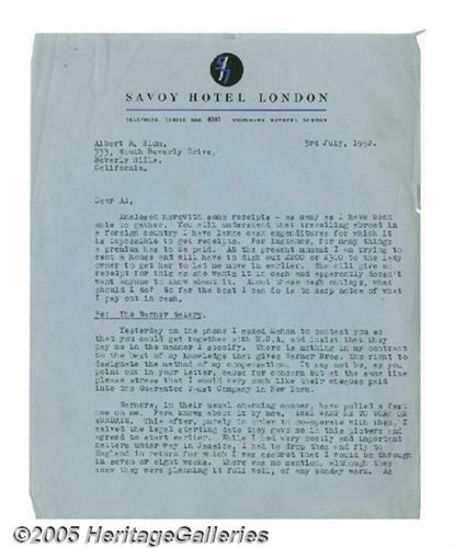 <B>Errol Flynn Signed Letter.</B></I> A three-page, typed letter on Savoy Hotel London stationery, dated July 3, 1952, to Albert Blum regarding Flynn's personal finances. It reads in part: "Warners, in their usual charming manner, have pulled a fast one on me. Park knows about it by now. They want me to work on Sundays." The letter features a few handwritten notes and is signed on the last page by Flynn in black fountain pen. In good condition with some wrinkling and minor tearing to the edges, and some moderate discoloration on the first page. <I>With COA from PSA/DNA.</B></I>