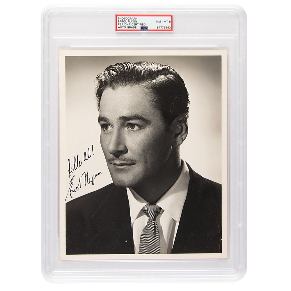 Vintage matte-finish 8 x 10 studio portrait photo of Flynn in a dapper up-close pose, signed and inscribed in fountain pen, "Hello Al! Errol Flynn.& rdquo; In fine condition, with a crease to the right background area. Encapsulated and graded by PSA/DNA as "NM-MT 8."