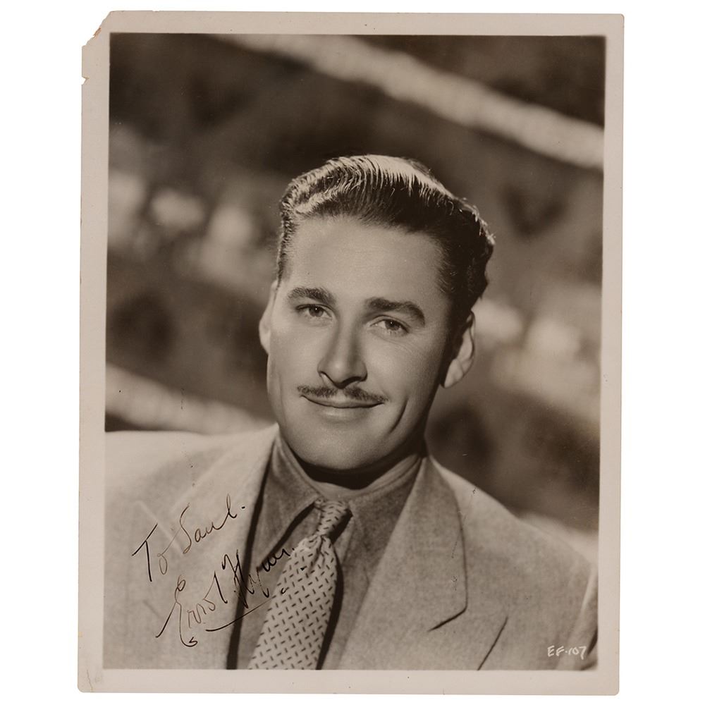 Vintage glossy 8 x 10 studio portrait of Flynn wearing a suit and tie with slicked back hair, signed and inscribed in fountain pen, "To Saul, Errol Flynn.†In very good to fine condition, with scattered light creasing, and loss to the upper left corner tip.