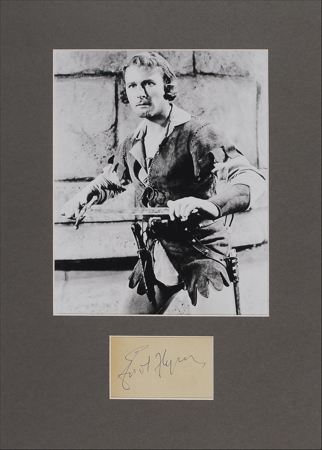 Vintage fountain pen signature, “Errol Flynn,” on an off-white 3.75 x 2.25 album page. Matted with a high-quality laser print image of Flynn as Robin Hood to an overall size of 12 x 17. In very good condition, with mild toning, heavier at the left side, and show-through from a signature on the reverse.
