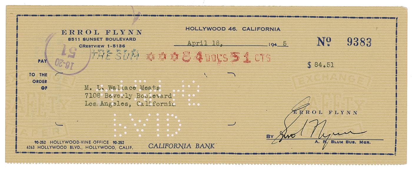 Personal check, 8.5 x 3.25, filled out in type and signed by Flynn, payable to M. L. Wallace Meats for $84.51, April 18, 1945. In fine condition, with expected stamps and cancellation holes, none affecting the clean signature area.