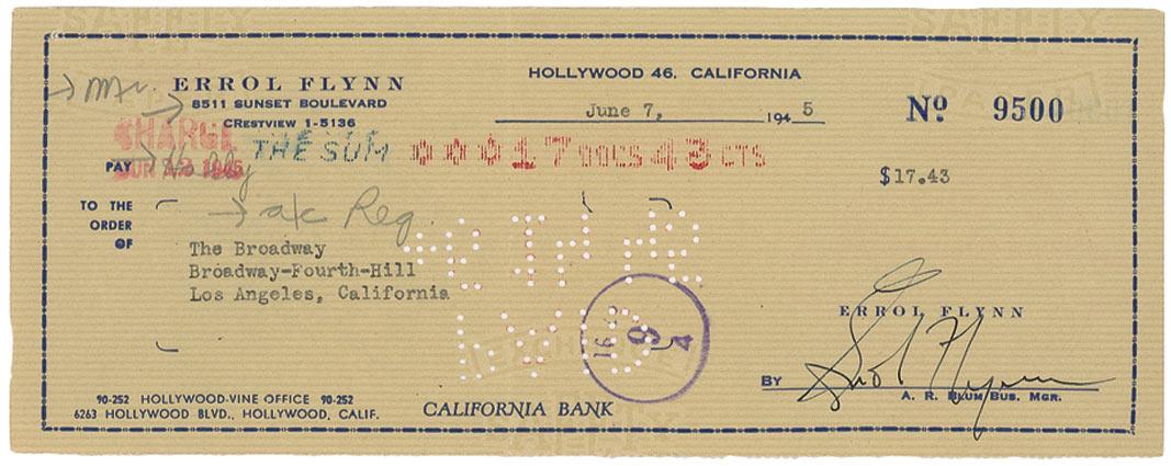 Personal check, 8.5 x 3.25, filled out in type and signed by Flynn, payable to The Broadway for $17.43, June 7, 1945. In fine condition, with a vertical fold and expected cancellation holes and stamps, none affecting the clean signature area.