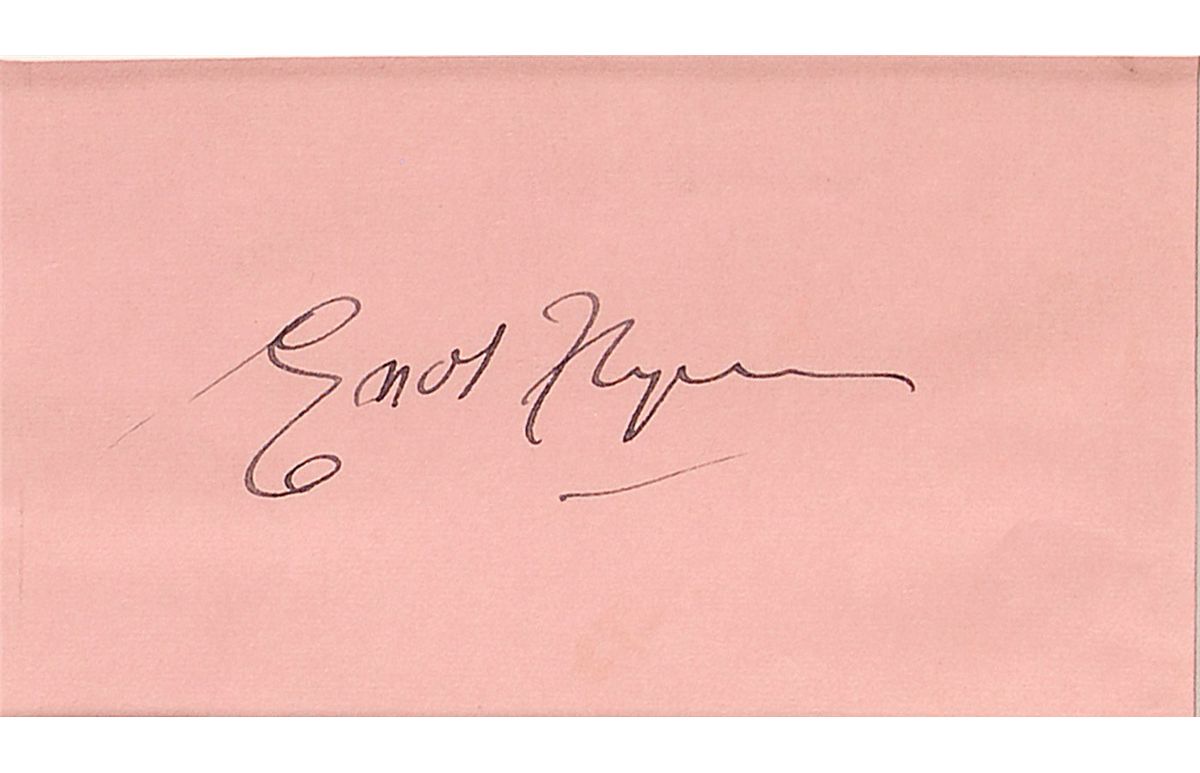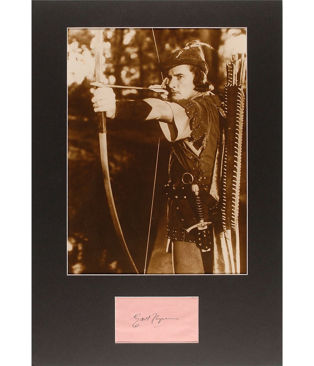 Vintage fountain pen signature, “Errol Flynn,” on a pink album page. Matted with an oversized portrait of Flynn as Robin Hood to an overall size of 13.75 x 20. In fine condition, with some light rippling and wrinkling to page.