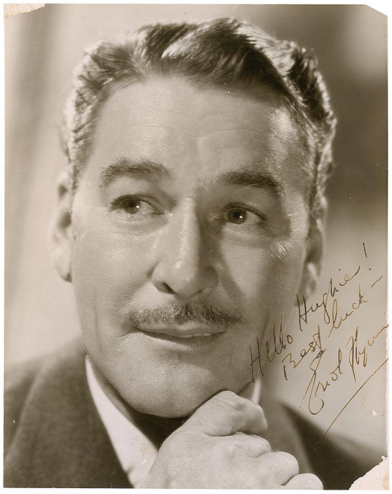 Vintage glossy 7.5 x 9.25 close-up photo, signed and inscribed in fountain pen “Hello Hughie! Best luck—Errol Flynn.” In very good condition, with trimmed edges, scattered creases and surface marks, and surface loss to two corners.