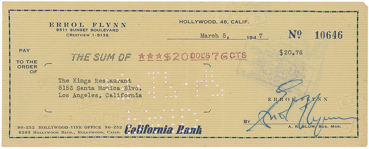 Personal check, 8.25 x 3.25, filled out in type and signed by Flynn, payable to The Kings Restaurant for $20.76, March 5, 1947. Two vertical folds and expected stamps and cancellation hole, with one stamp over top portion of beginning of signature, otherwise fine condition.