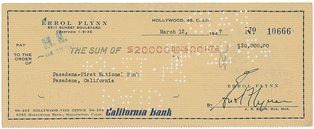 Personal check, 8.25 x 3.25, filled out in type and signed by Flynn, payable to Pasadena-First National Bank for $20,000.00, March 12, 1947. In fine condition, with a couple corner tip dings and expected cancellation stamps and holes, none affecting the clean signature area.