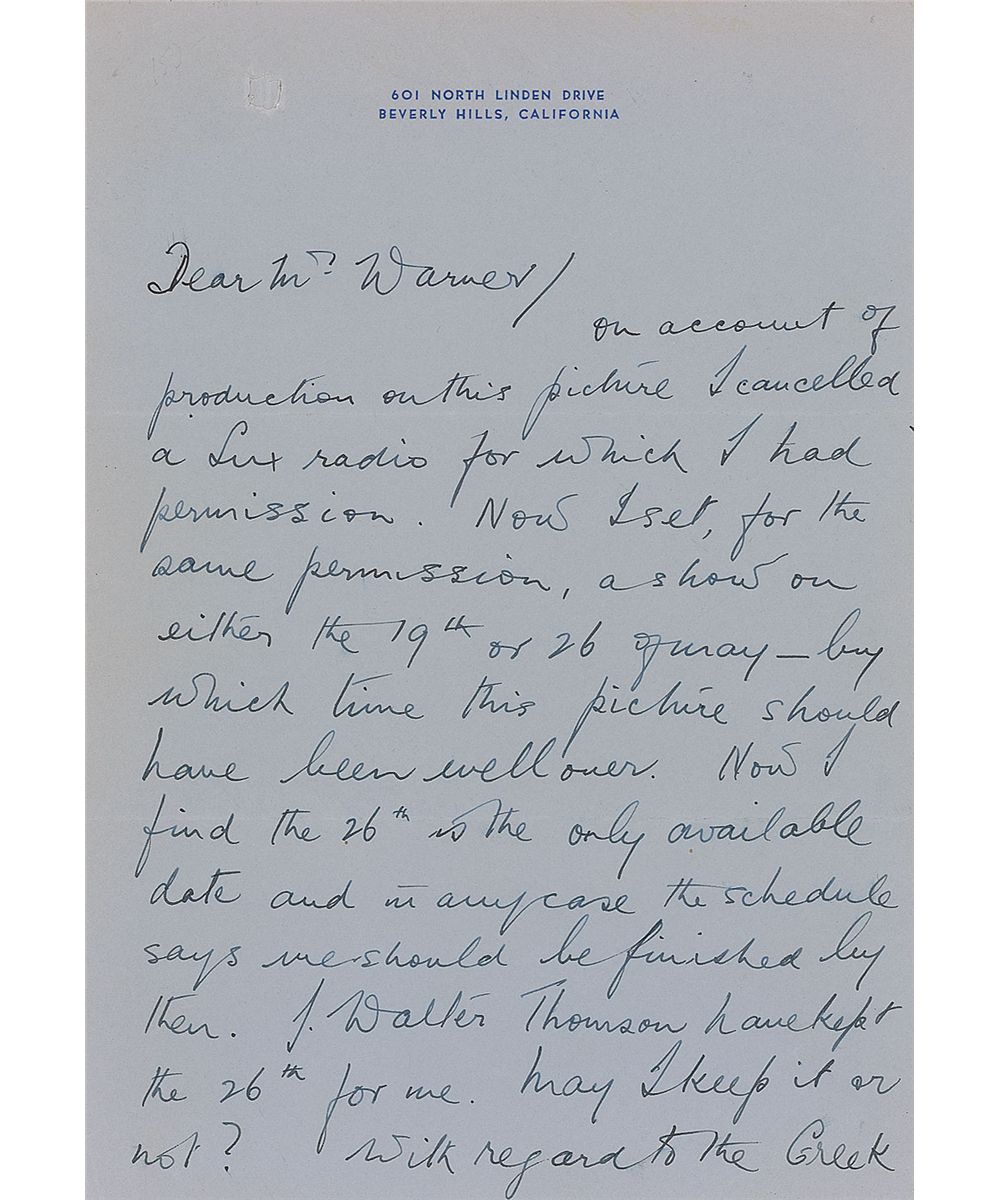 ALS, one page both sides, 7.25 x 10.5, personal letterhead, no date but circa 1941. Letter to Jack Warner. In part: “On account of production on this picture I cancelled a Lux radio for which I had permission. Now I get, for the same permission, a show on either the 19th or 26 of May—by which time this picture should have been well over…J. Walter Thomson have kept the 26th for me. May I keep it or not? With regard to the Greek relief I think I intimated to you before that I consider my charitable contributions of such a highly personal nature that I keenly resent pressure…since the North of Ireland, having been well bombed, has not so far received one penny from any British war relief I am henceforth sending my contributions there direct.” In fine condition, with a puncture to the upper left (not affecting any text). It seems that Flynn’s request was granted, as he appeared on Lux Radio Theatre’s ‘Virginia City’ episode on May 26, 1941. A fascinating letter which displays Flynn’s affinity for the underdog and the increasingly strained relationship between him and Warner.