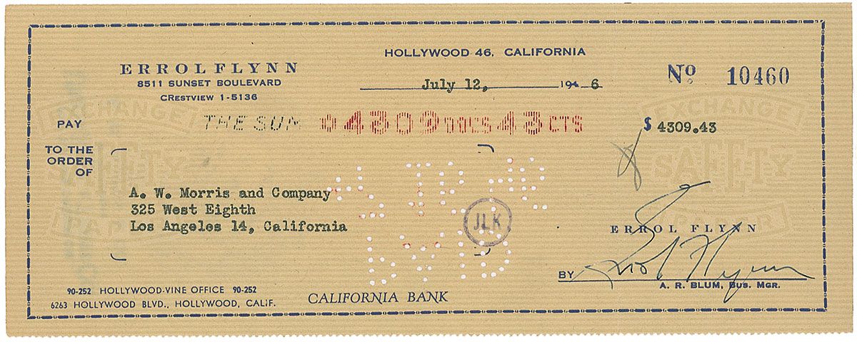Personal check, 8.5 x 3.25, filled out in type and signed by Flynn, payable to A. W. Morris and Company for $4309.43, July 12, 1946. In fine condition, with a vertical fold through a single letter of signature and expected cancellation holes and stamps.