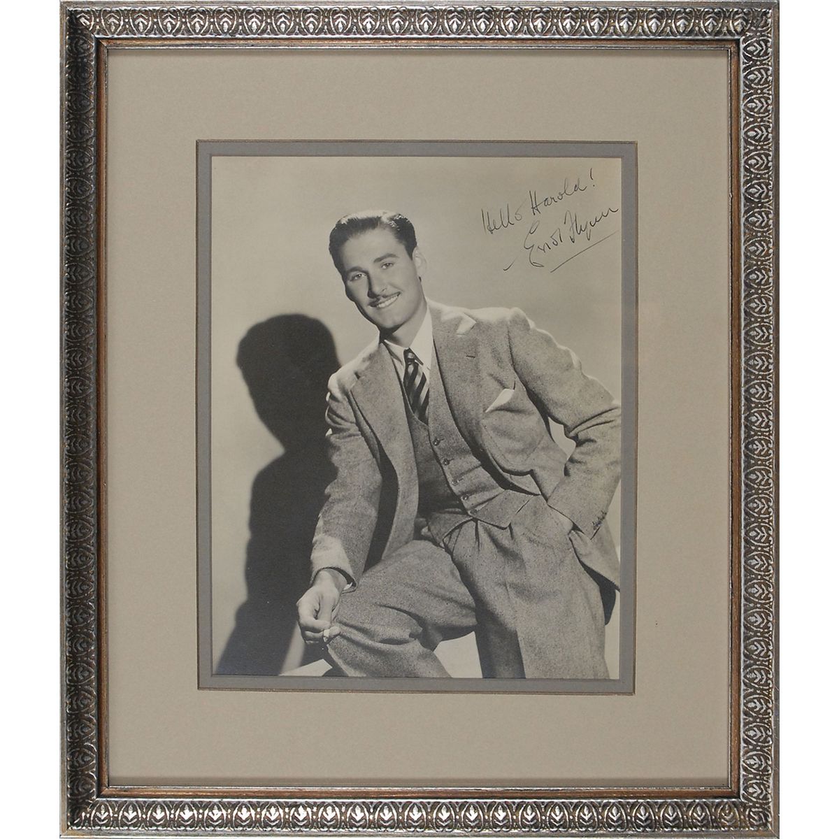 Dapper vintage matte-finish 7 x 9.25 photo of Flynn in a three-piece suit with a cigarette in his hand, signed and inscribed in fountain pen, “Hello Harold! Errol Flynn.” Archivally double-matted and framed to an overall size of 12.5 x 14.5. In fine condition.