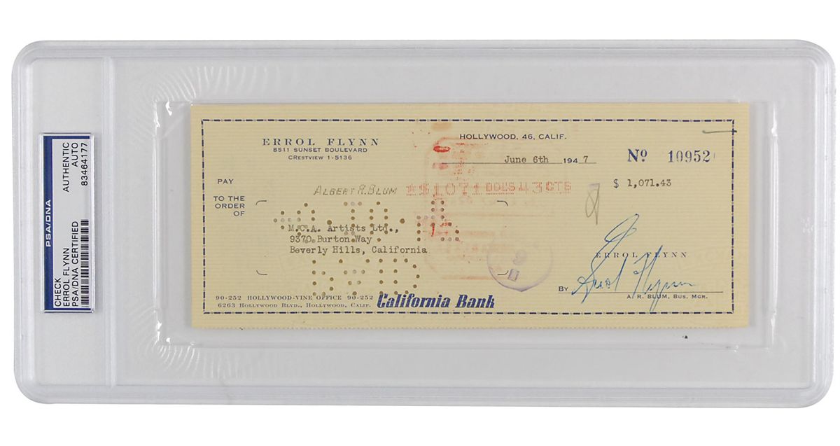 Personal check, 8.25 x 3.25, filled out in type and signed by Flynn, payable to Albert R. Blum for $1071.43, June 6, 1947. Encapsulated in a plastic PSA/DNA authentication holder. In fine condition, with expected bank stamps and cancellation holes (far from and not affecting the signature).