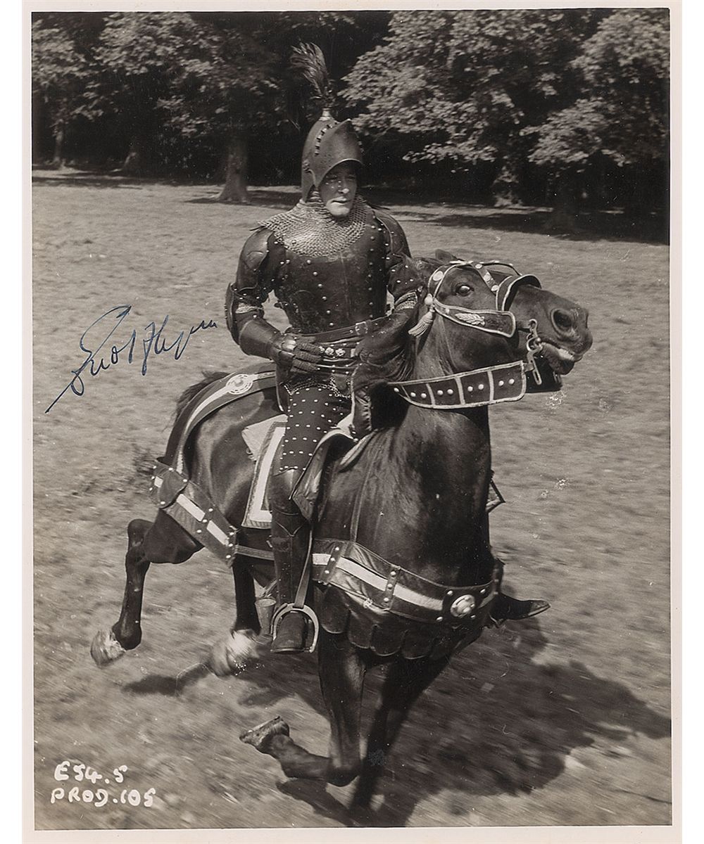 Action-packed vintage 8 x 10 photo of an armor-clad Flynn on horseback, as he appeared in the 1955 film The Warriors, signed in fountain pen. In fine condition. Also known by its European release name The Dark Avenger, The Warriors was Flynn’s final swashbuckling role.