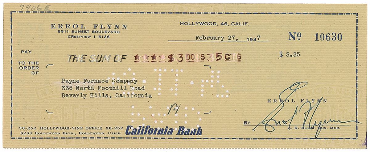 Personal check, 8.25 x 3.25, filled out in type and signed by Flynn, payable to Payne Furnace Company for $3.35, February 27, 1947. In fine condition.