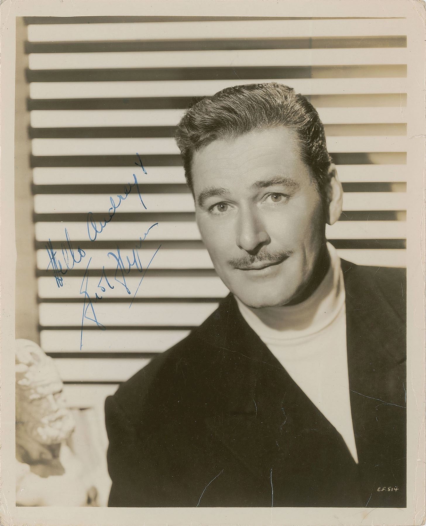 Vintage glossy 8 x 10 studio portrait of Flynn wearing a suit jacket and turtleneck, signed and inscribed in blue fountain pen, "Hello Audrey! Errol Flynn.” In very good condition, with moderately heavy overall creasing.