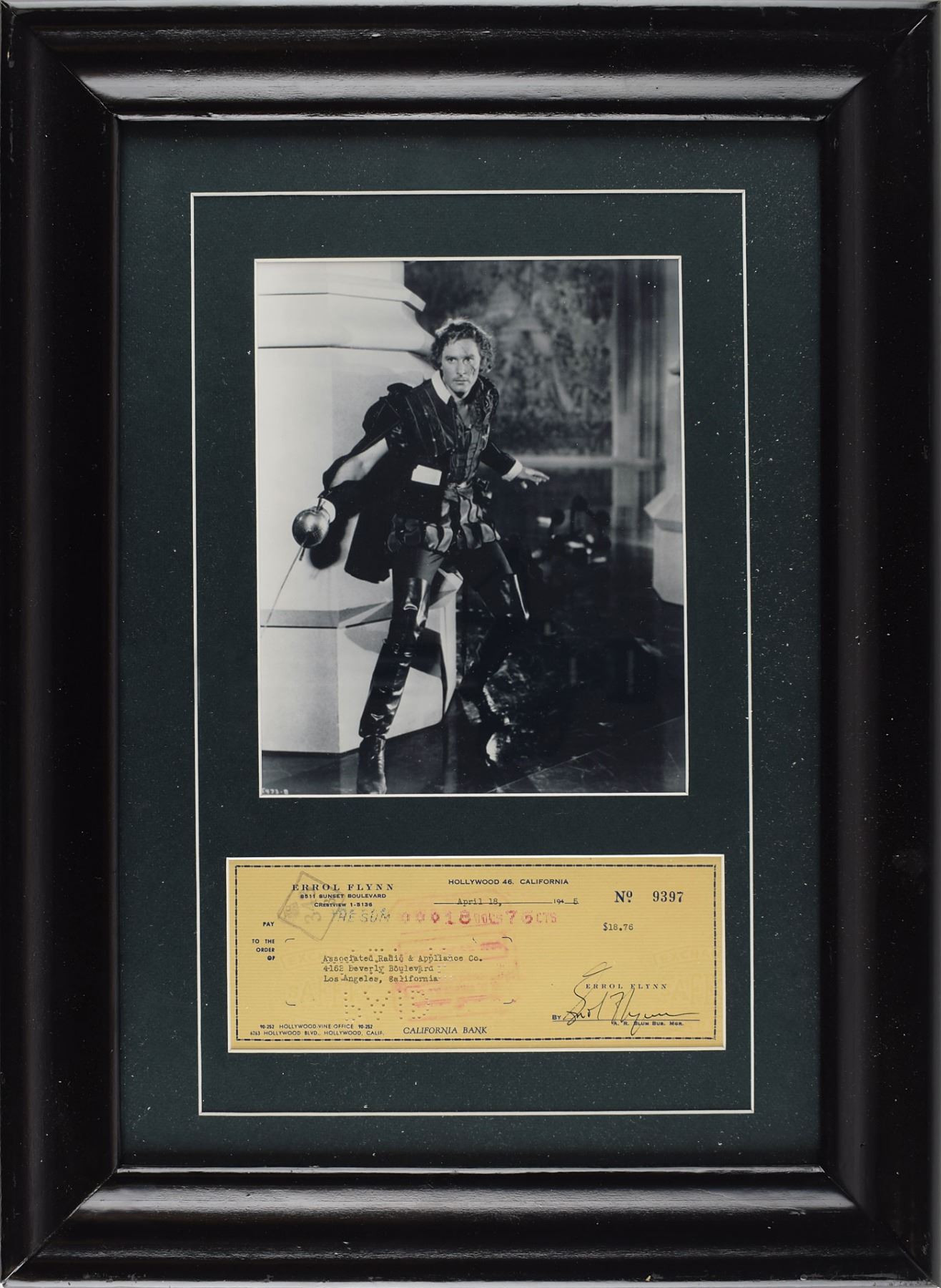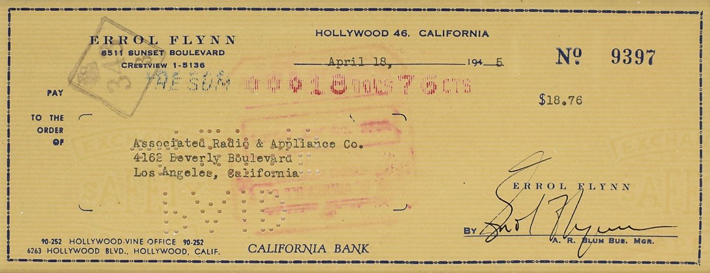 Personal check, 8.25 x 3.25, filled out in type and signed by Errol Flynn, payable to Associated Radio & Appliance Co. for $18.76, April 18, 1945. Double-matted and framed with a photo of the swashbuckling actor to an overall size of 15.75 x 21.25. In fine condition.