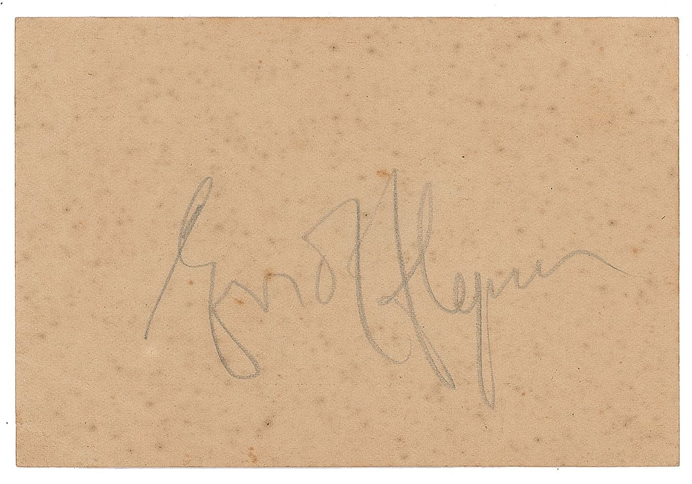 Vintage pencil signature, "Errol Flynn,” on the reverse of an off-white 4.5 x 3 table reservation card from the Copacabana Palace, dated July 8, 1940 on the opposite side. In very good condition, with creasing to the lower left corner, and overall foxing affecting appearance.