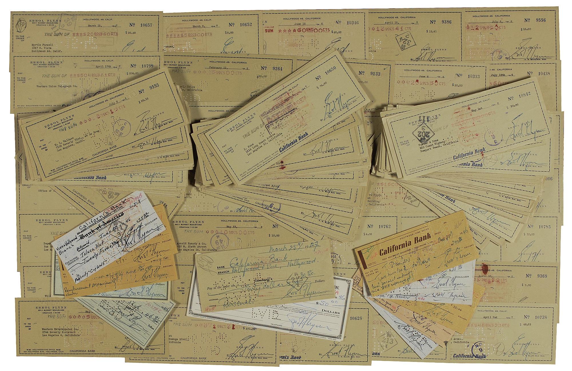A swashbuckling presentation of Errol Flynn signed checks! This astonishing collection consists of 320 personal and bank checks, 6.25 x 2.75 to 8.5 x 3.5, all from the 1940s. The majority have been filled out in type and signed by Flynn, with 11 examples filled out in their entirety and signed by the flamboyant actor. Physicians, markets, laundromats, book stores, utilities—the payments are seemingly endless! In very good to fine condition with expected cancellation bank holes and stamps. The ultimate (and to reiterate, enormous) gathering of Flynn-signed checks! RRAuction COA.