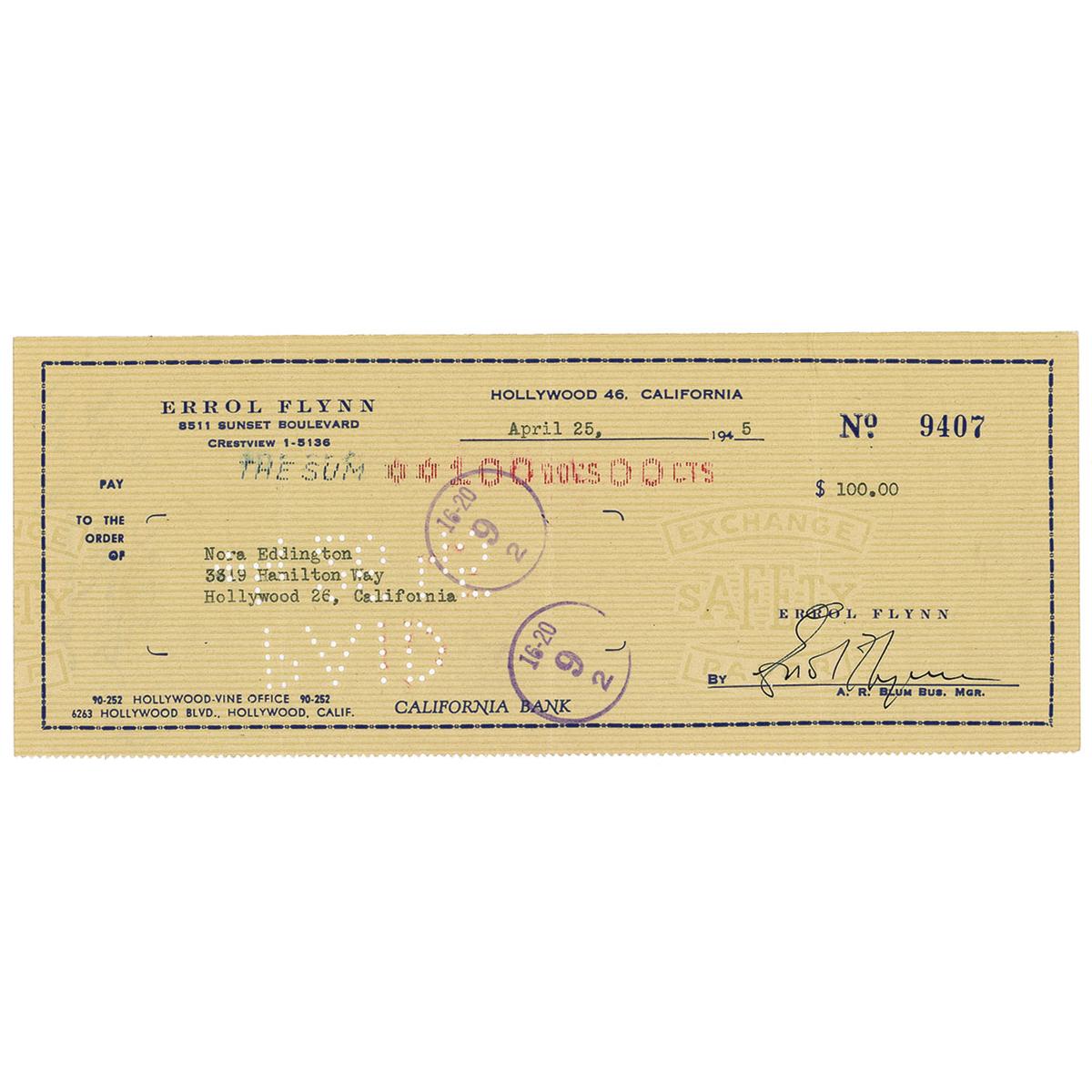 Personal check, 8.5 x 3.5, filled out in type and signed by Flynn, payable to Nora Eddington for $100.00, April 25, 1945. Three vertical folds, one through a single letter of signature, and expected cancellation holes and stamps, otherwise fine condition.
