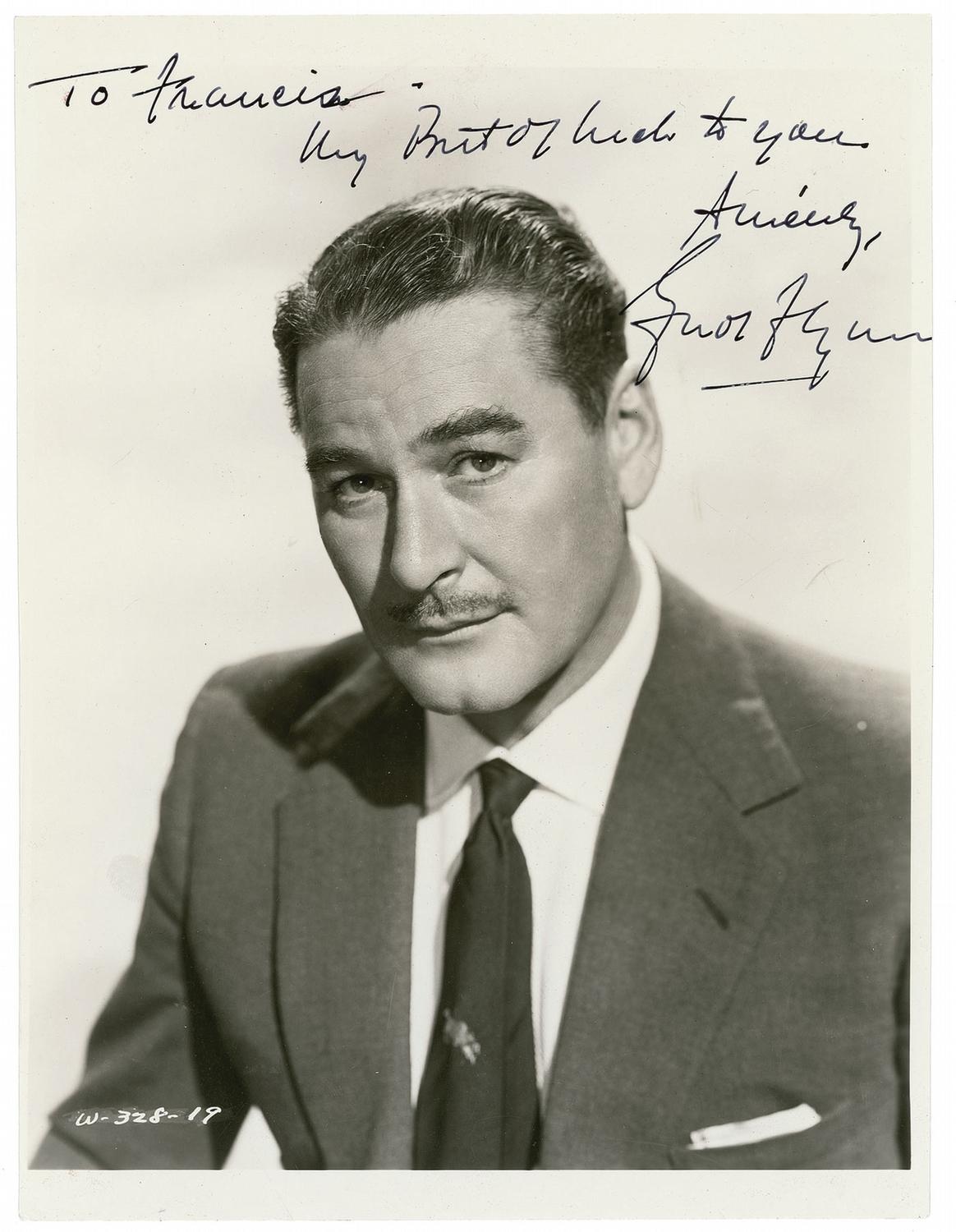 Vintage glossy 7.5 x 10 photo of the middle-aged actor, signed and inscribed in fountain pen “To Francis, Very best of luck to you, Sincerely, Errol Flynn.” In fine condition, with a lightly trimmed left edge, some scattered light surface dings and creases, and a couple trivial brushes to inscription.