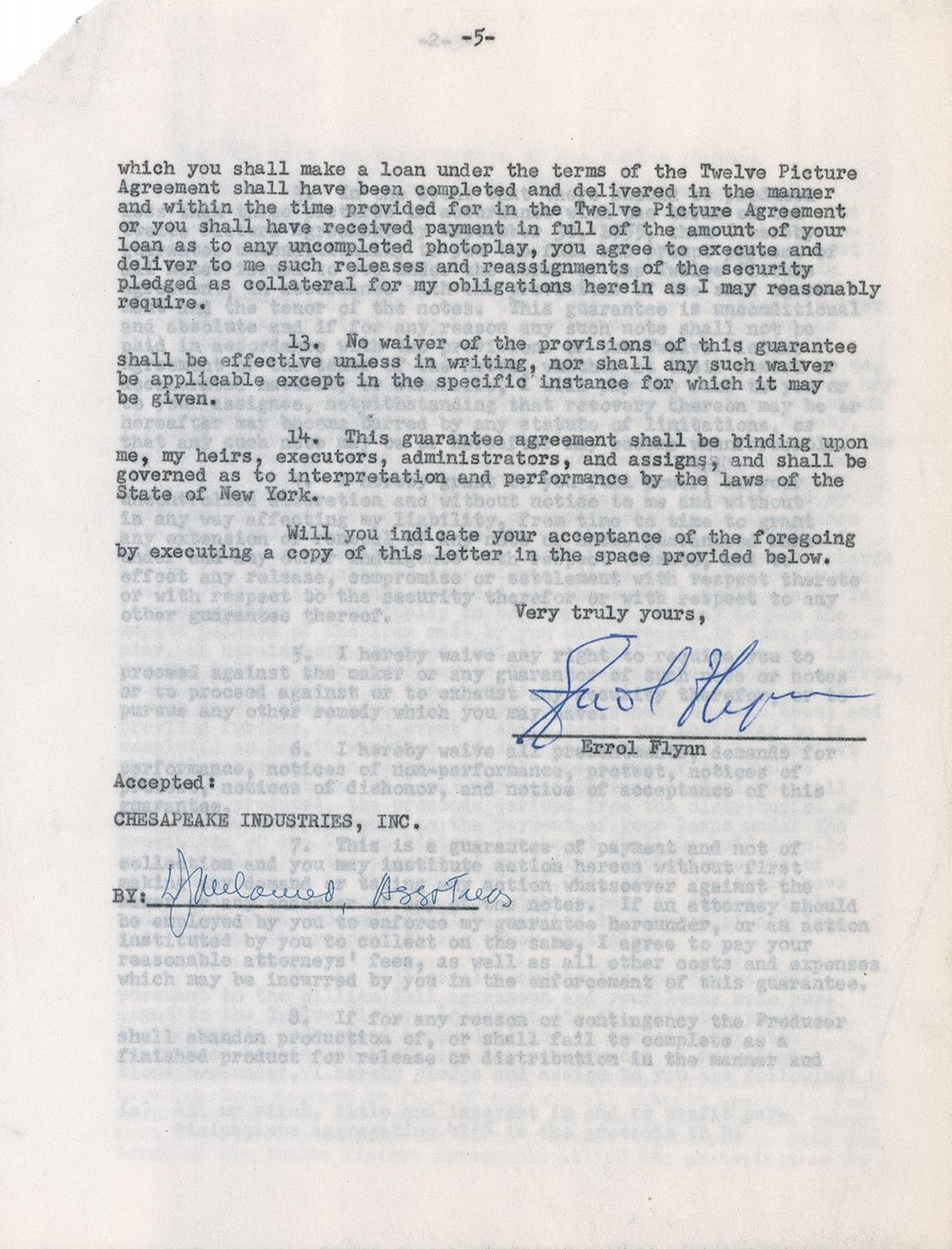 DS, five onionskin pages, 8.5 x 11, August 7, 1953. Loan agreement for the unfinished film The Story of William Tell. The contract is between Errol Flynn and Chesapeake Industries in order to secure a loan for The Story of William Tell. Many guarantees are made by Flynn in order to secure the loans for the movie, including, in part, "If for any reason or contingency the Producer shall abandon production of…any photoplay as to which you shall make any loan…I shall assume all responsibility for completion of any such photoplay and, at my own cost and expense, will cause such photoplay to be fully completed …" As collateral for the loan, Flynn uses his agreed to profits from two upcoming films, an original Van Gogh and an original Gauguin. In very good condition, with scattered creasing and wrinkling, staple to top left corner, first page detached, and some scattered toning. Because of issues with funding, Flynn would eventually use most of his own fortune to pay for a movie that was never finished.