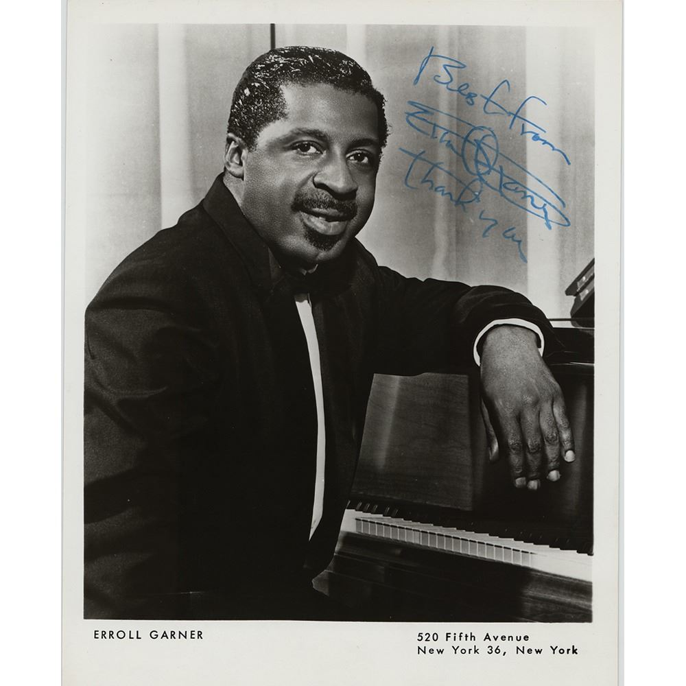 American jazz pianist and composer (1923-1977) who is best known for the jazz standard 'Misty.' Glossy 8 x 10 publicity photo of Garner in a half-length pose seated casually at his piano, signed in blue felt tip, "Best from Erroll Garner, Thank you." In fine condition.
