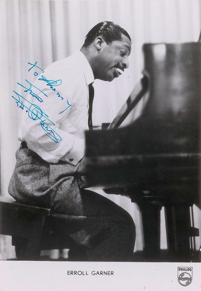 American jazz pianist and composer (1923–1977) who is best known for the jazz standard 'Misty.' Vintage glossy 6.5 x 9.25 Philips publicity photo of Garner smoking a cigarette while seated at a piano, signed and inscribed in blue fountain pen, "To Johnny, From, Erroll Garner.” In very good to fine condition, with trimmed edges.