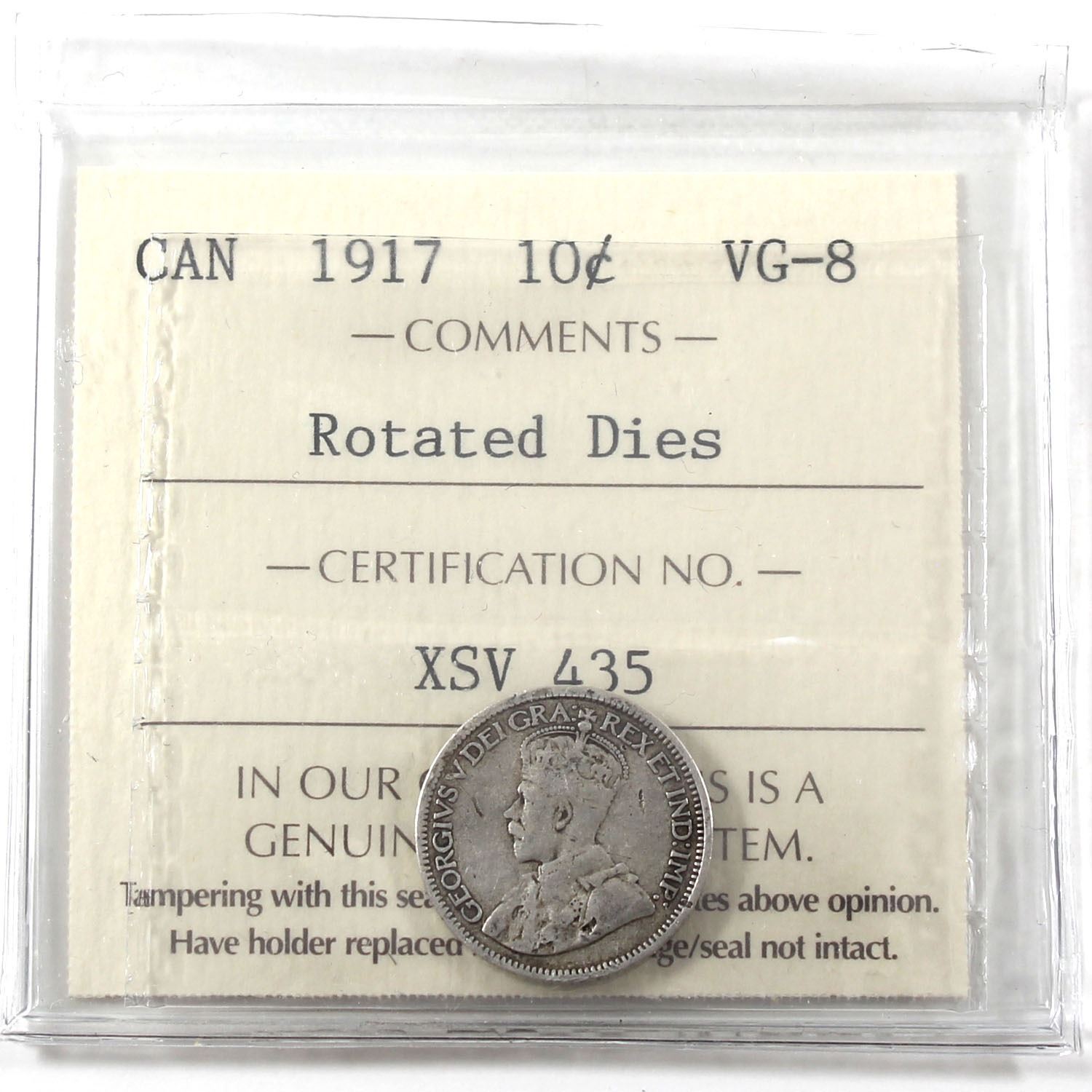 Error 10-cents 1917 Rotated Dies 315 degrees, ICCS Certified VG-8! *Rare*
