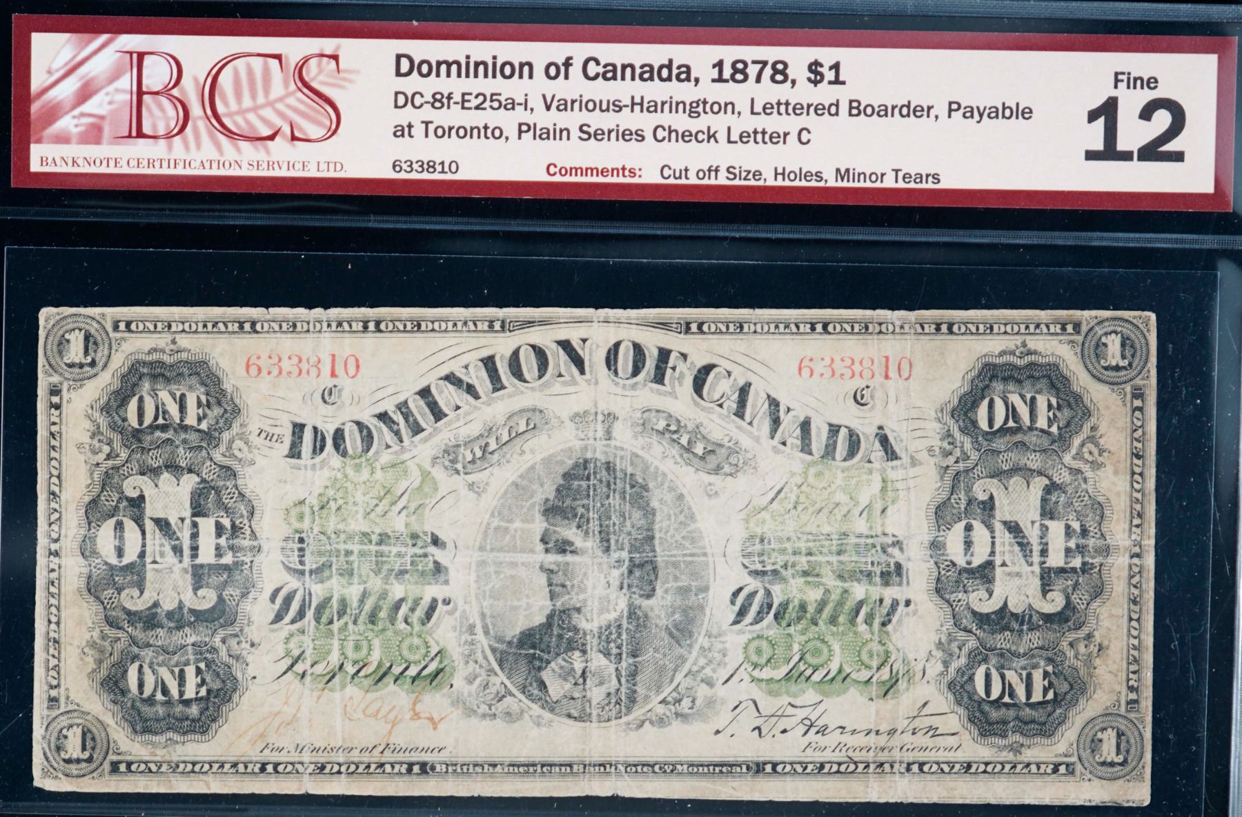 Error; 1878 $1 DC-8f-E2a-i #633810 BCS Fine-12 with issues. Cut off size.