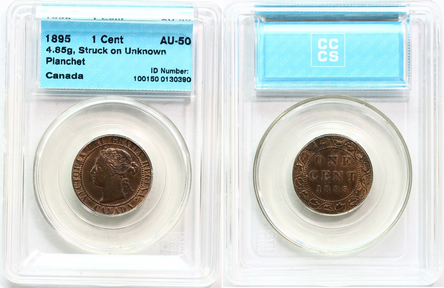 Error; 1895 1¢ "Struck on unknown planchet" CCCS About Uncirculated-50. 4,85 grams. A very cool and attractive example. Believed to be quite scarce.