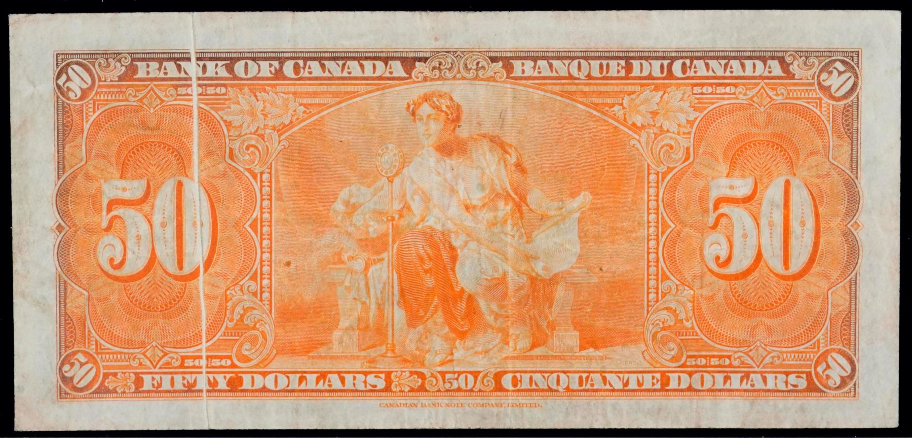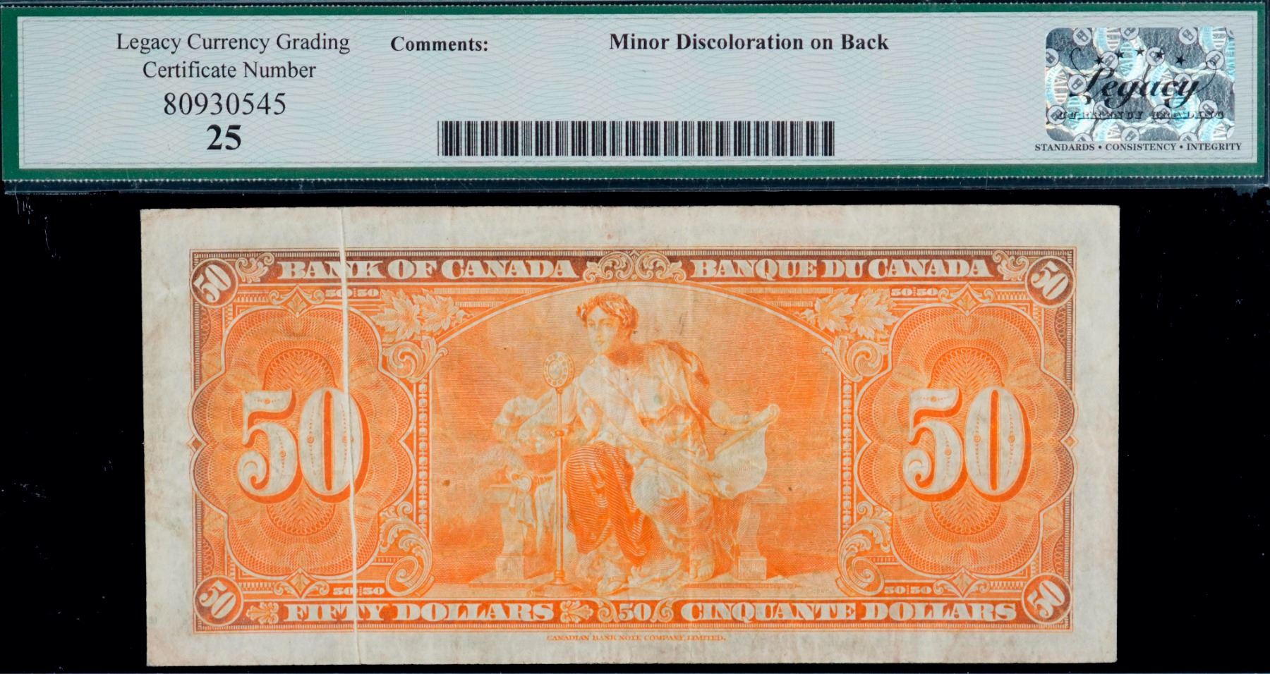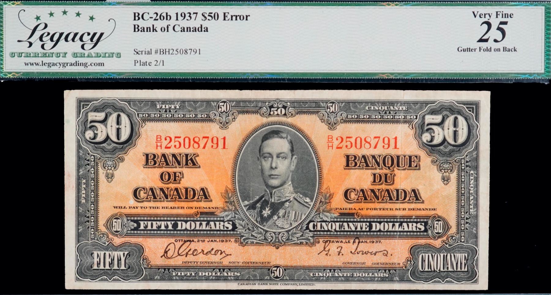 Error; 1937 $50 BC-26b B/H2508791 Legacy Currency Grading Choice Very Fine-25 "Gutter fold on back" Believed to be very scarce on 1937 series and on high denominations. First one seen and offered by TCNC.