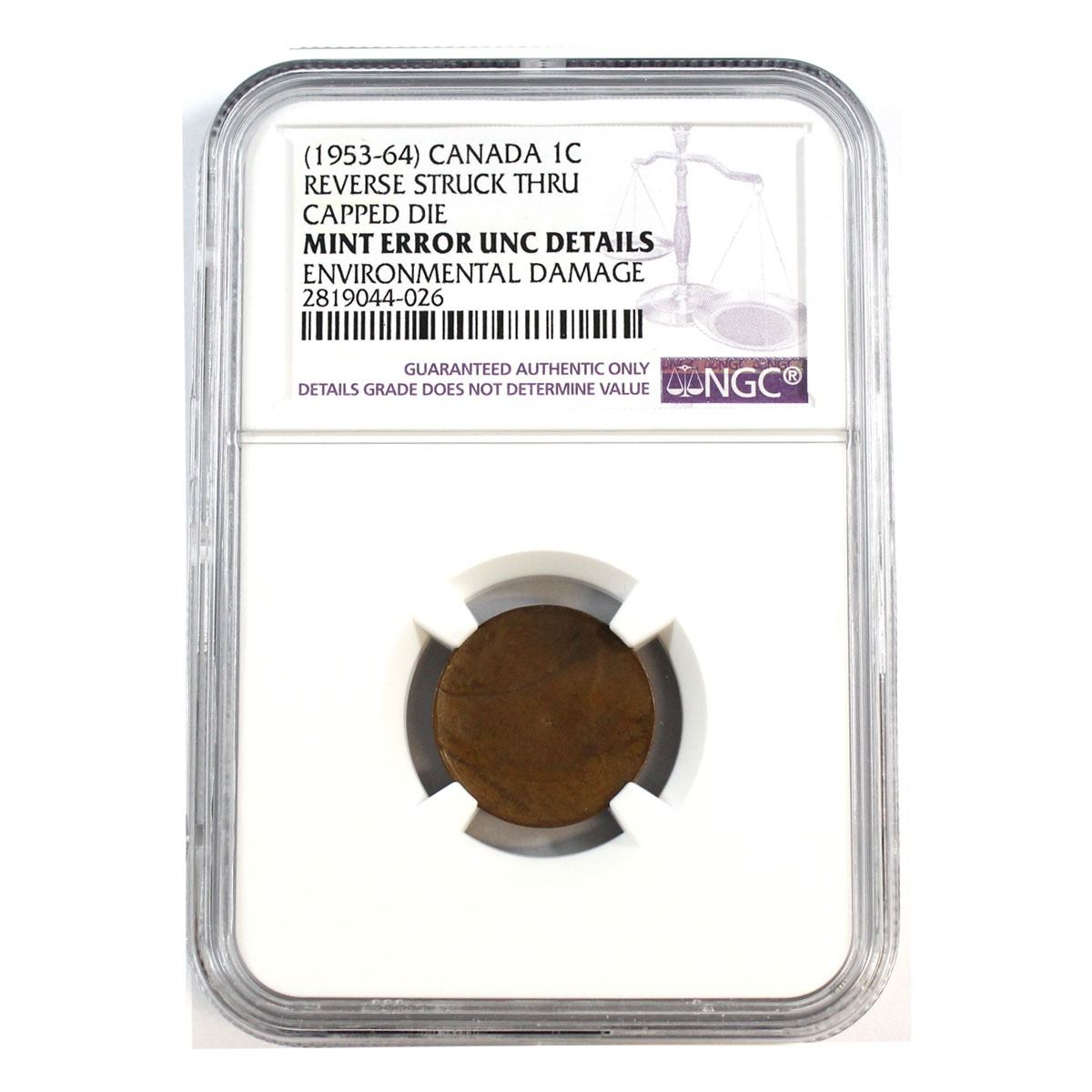 Error (1953-64) Canada 1-cent Reverse Struck through Capped Die. NGC Certified UNC Details - Environmental Damage.