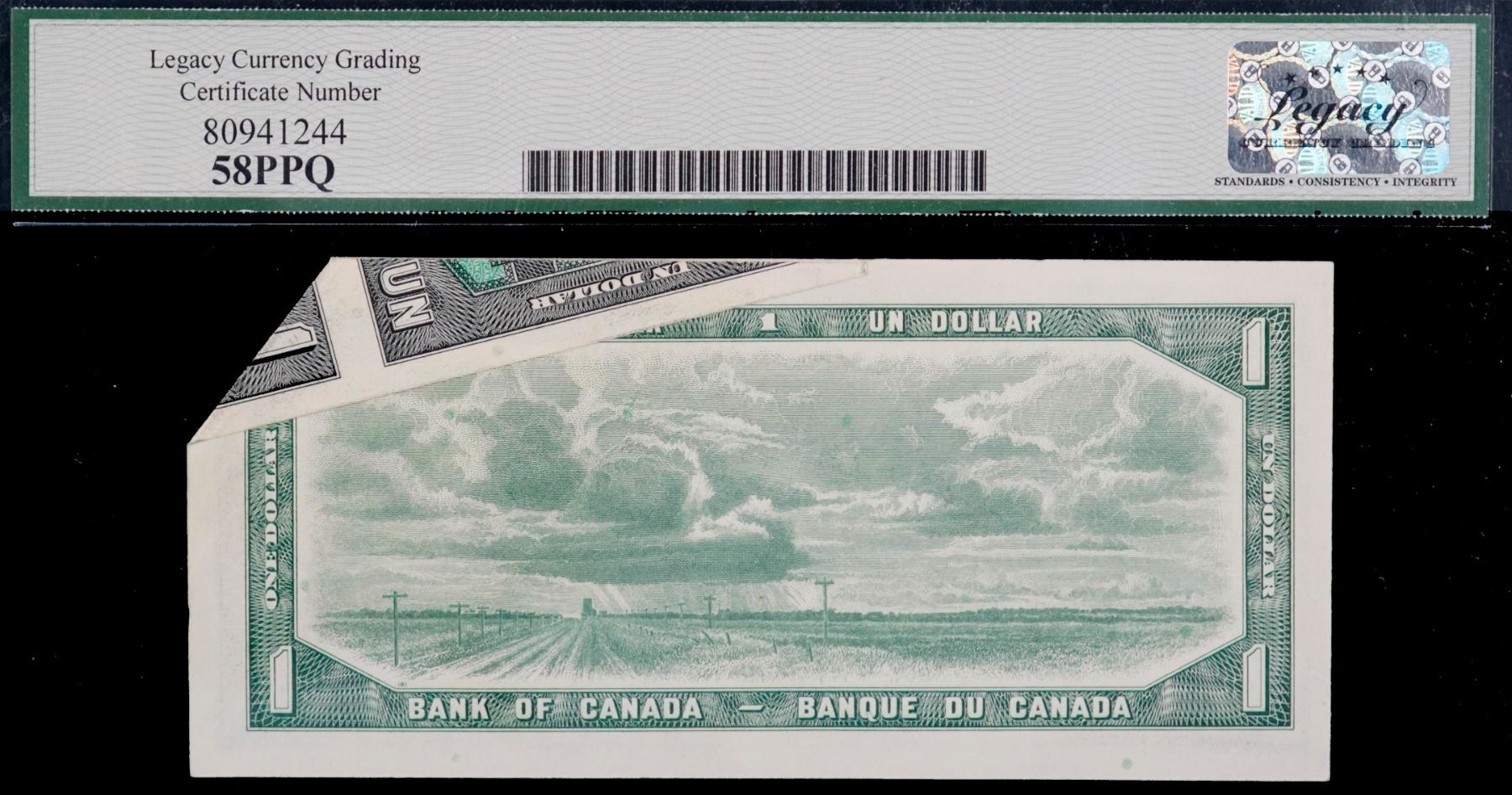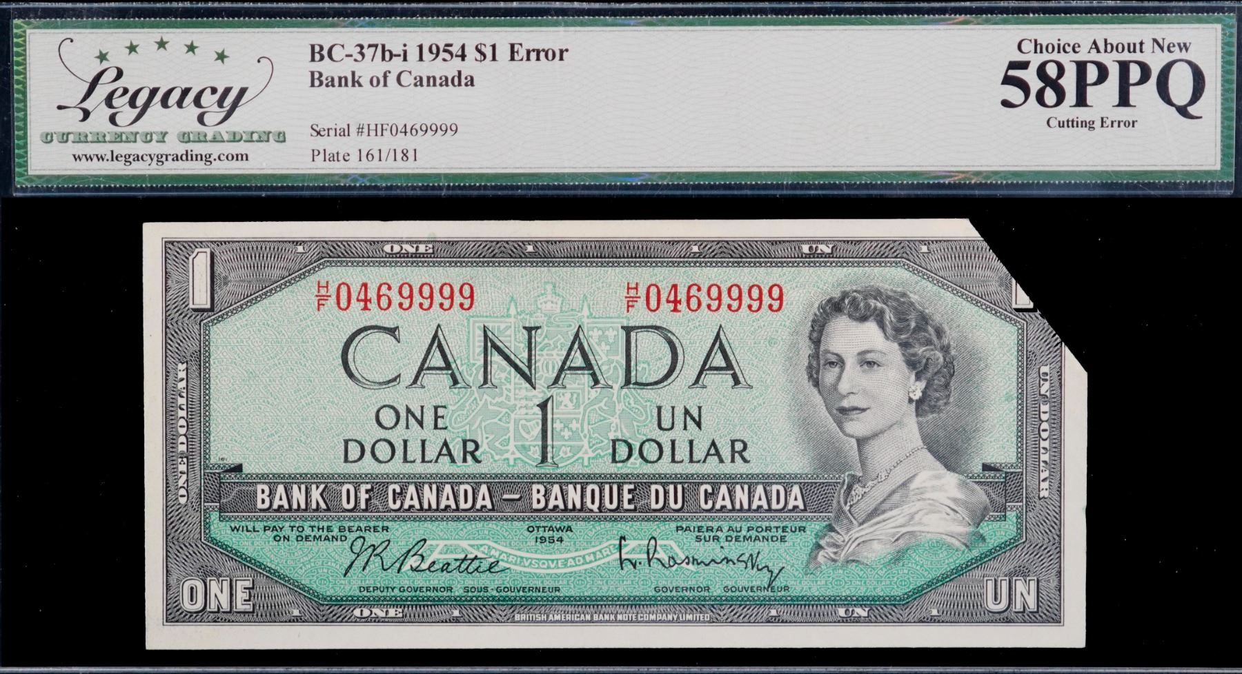 Error; 1954 $1 #H/F0469999 Legacy Currency Grading Choice About Uncirculated-58PPQ "Cutting error" Large extra piece attached at upper right showing the top note