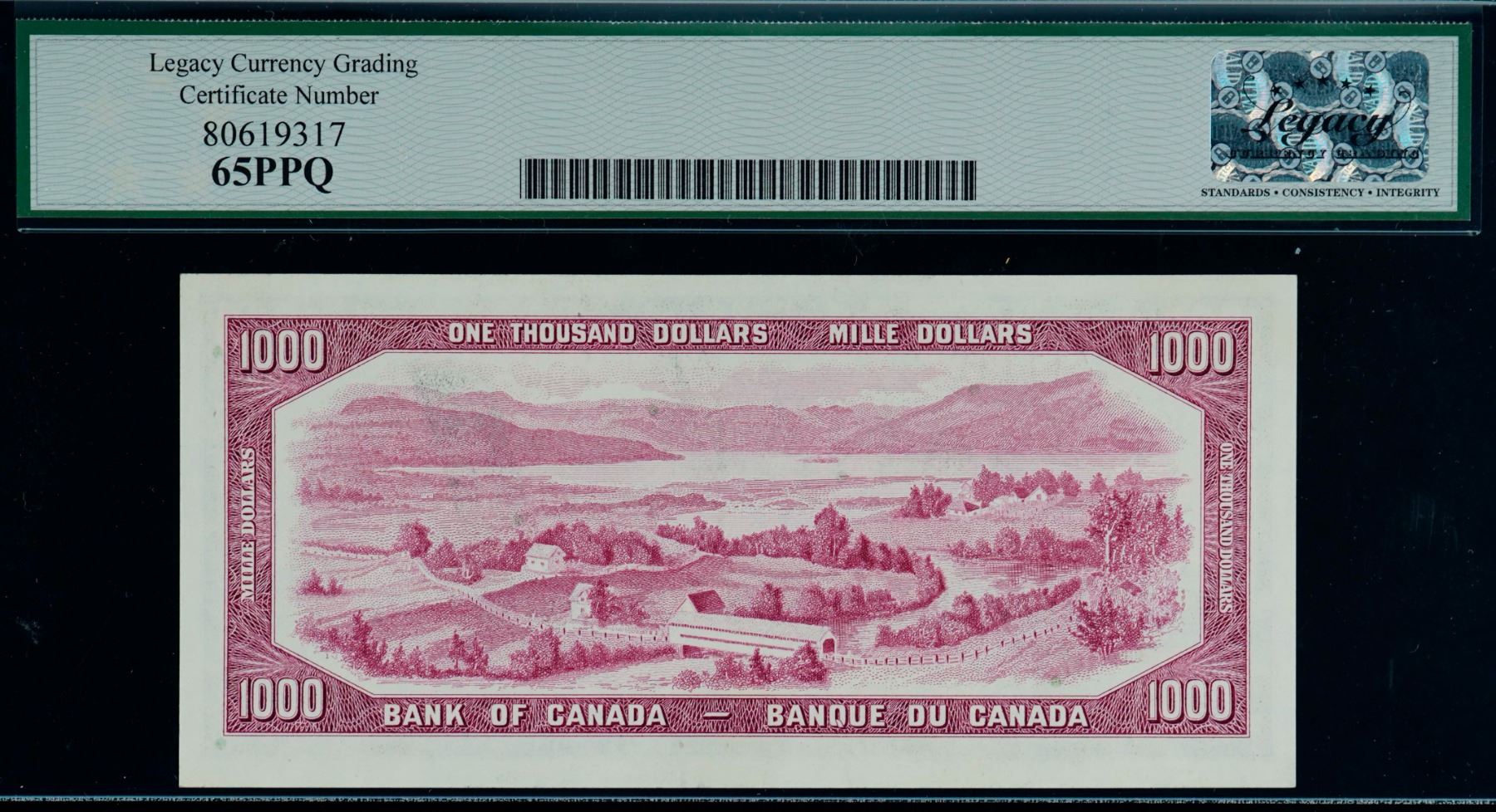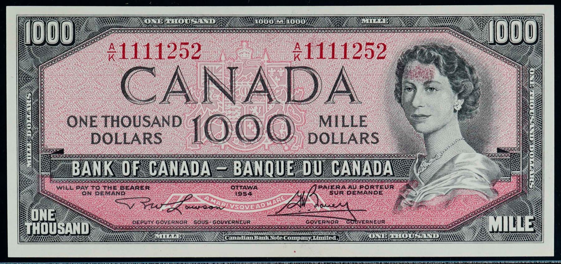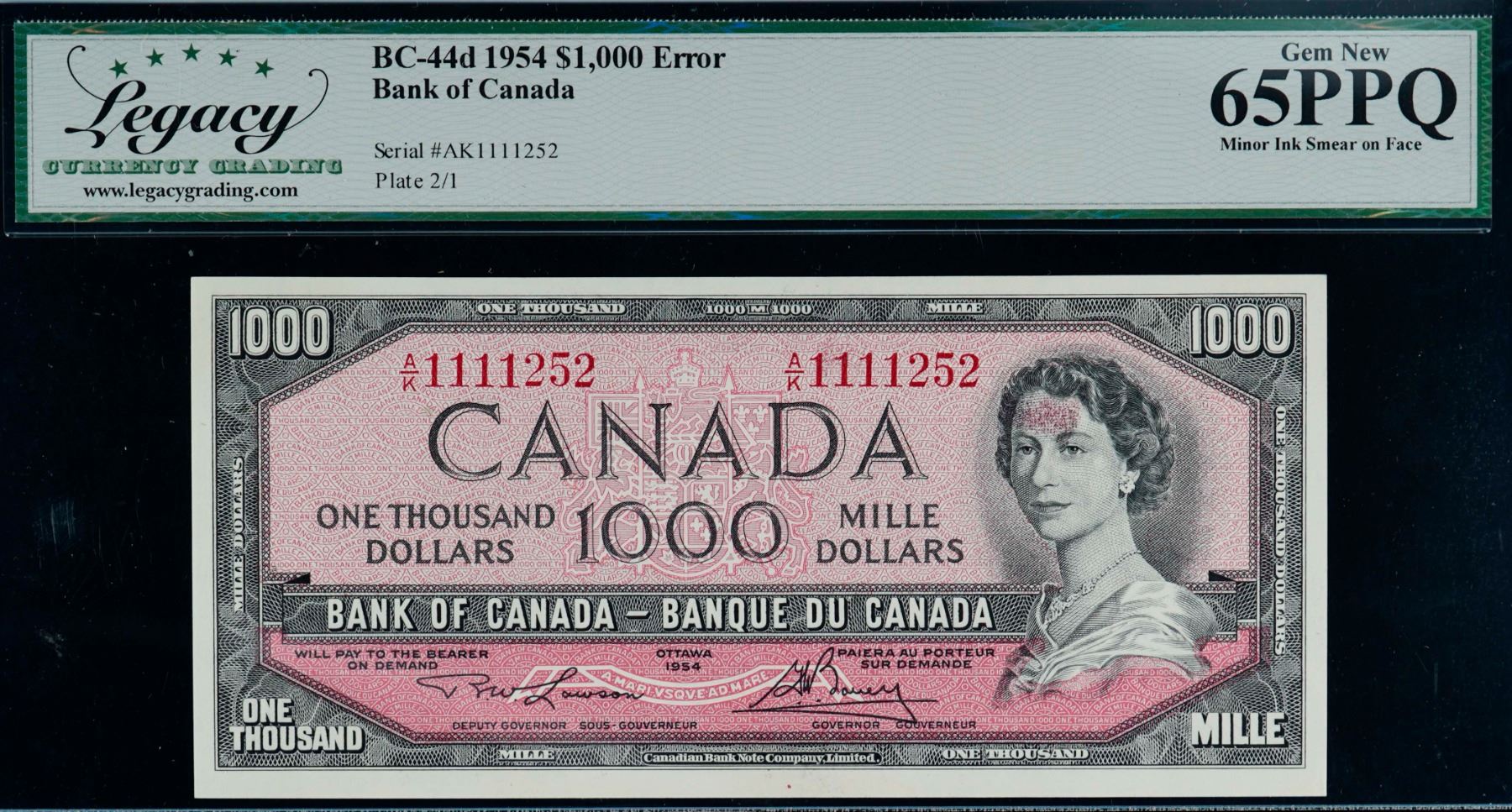 Error; 1954 $1000 #A\K1111252 Legacy Gem Uncirculated-65PPQ - "Ink smear on face". Errors on high denominations are excessively scarce. First one seen in 40+ years. This would be an important addition to a major collection or a major highlight of a personal collection. A 'tasty' find for any serious collector and will most certainly serve as an absolute treasure in their collection. Worth a premium bid.