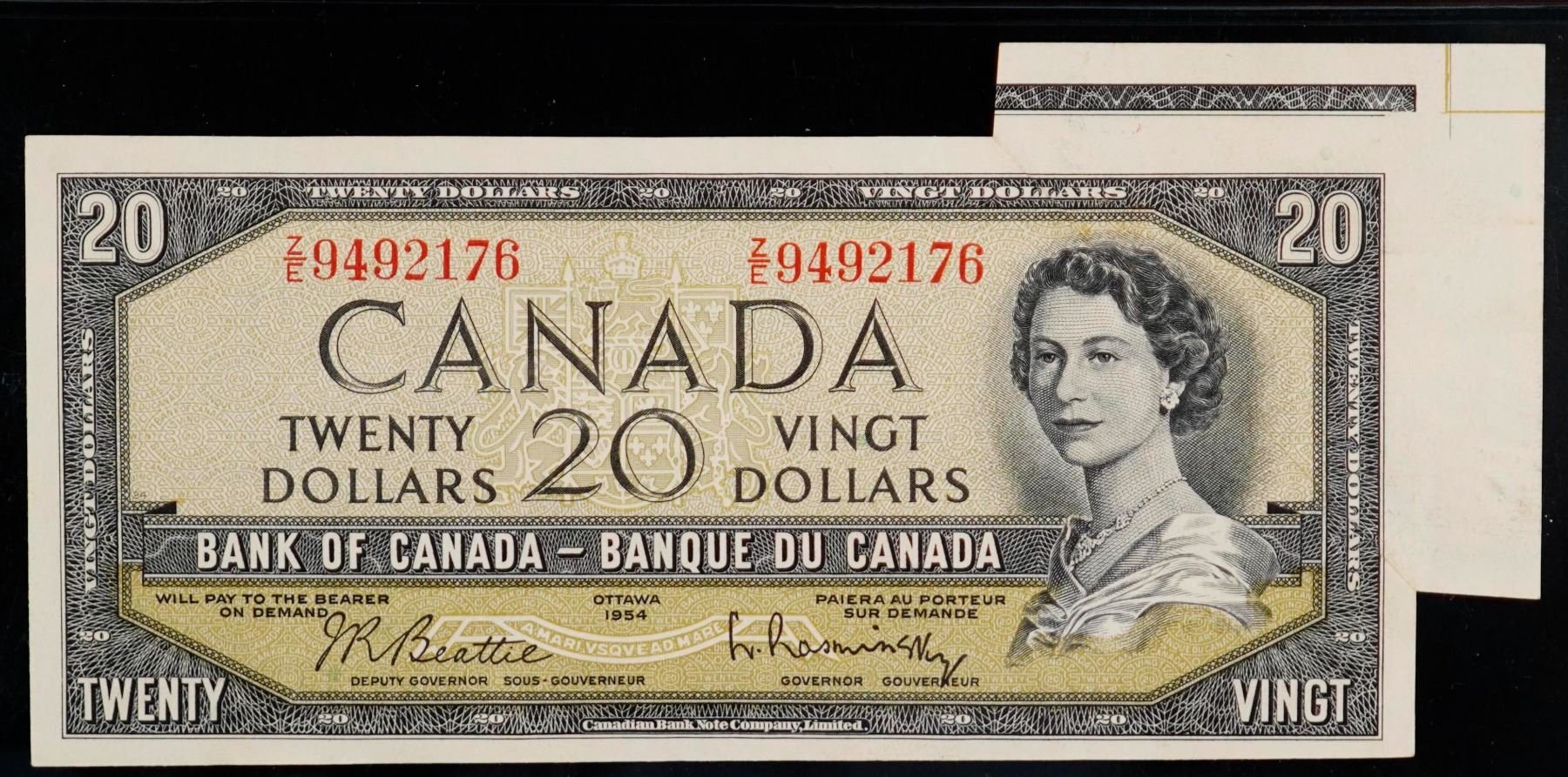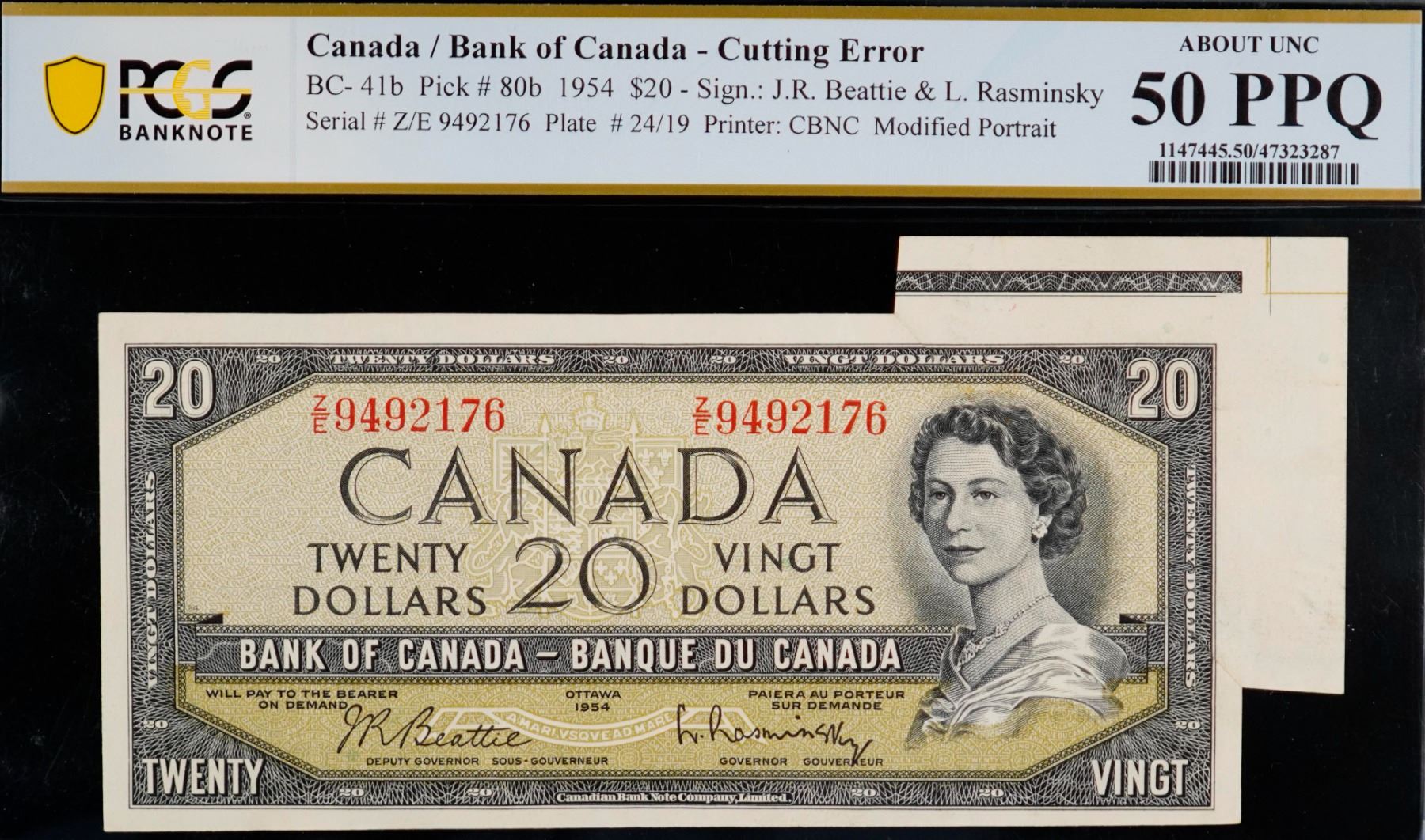 Error; 1954 $20 BC-41b Z/E9492176 PCGS About Uncirculated-50 PPQ "Major Cutting error"